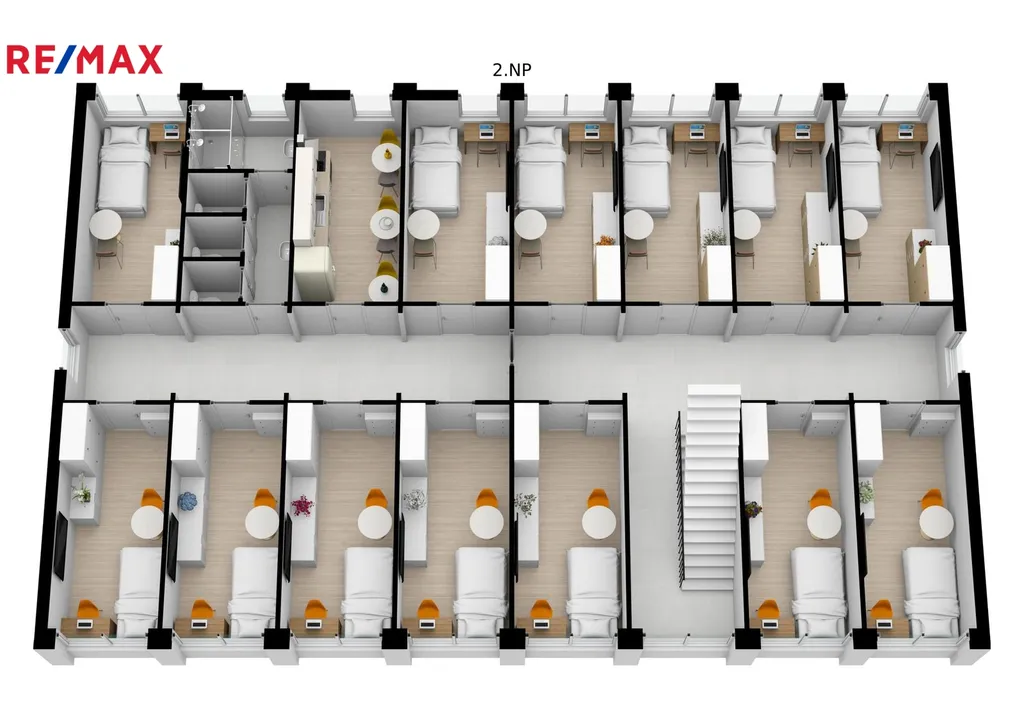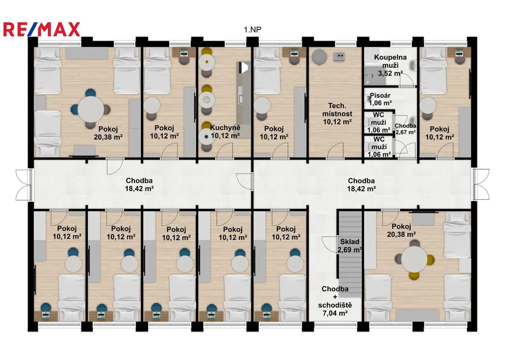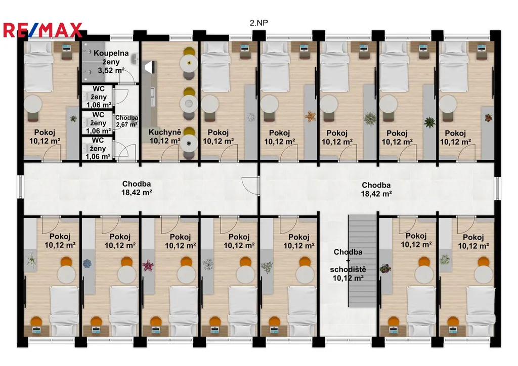 Na pozemku se nachází dvoupatrová budova ubytovny, o zastavěné ploše 237 m2, která prošla v roce 2016 kompletní rekonstrukcí, zahrnující nová okna, dveře, zateplení, podlahy. Celkem obsahuje 23 zařízených pokojů, dvě kuchyně, sociální zařízení, atd.