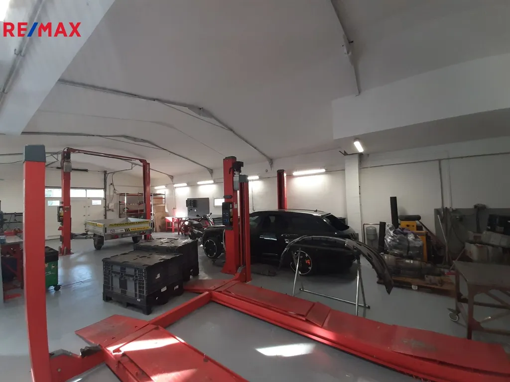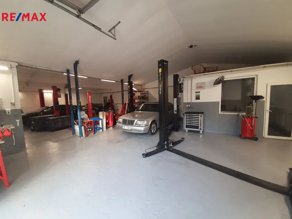 Dále se na pozemku nachází autoservis – o zastavěné ploše 233 m2, jehož vnitřní řešení je následující: pneuservis / měření emisí 64 m2, sklad maziv 7,5 m2, kancelář 13 m2, autoservis 129 m2, WC, sprcha, šatna 15 m2. Jeho vybavení představuje 4x dvou sloupový zvedák 4t, 1x čtyř sloupový zvedák + 3D podvozková geometrie, pneuservis, kompresor + tlaková nádoba 500l, plnička klimatizací, rozvod vzduchu po celé dílně, ponky, kompletní sortiment ruční, elektrické, pneumatické nářadí, sociální zázemí (sprcha, WC, relax zóna), kancelář vč. vybavení (PC, tiskárna, skener), kamerový systém, ústřední vytápění, 2x garážová sekční vrata výška 2,7m na DO, volná parkovací plocha pro cca 30 vozidel.