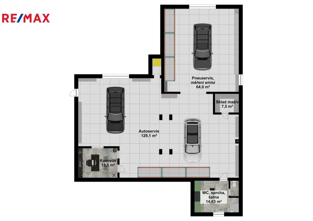 Dále se na pozemku nachází autoservis – o zastavěné ploše 233 m2, jehož vnitřní řešení je následující: pneuservis / měření emisí 64 m2, sklad maziv 7,5 m2, kancelář 13 m2, autoservis 129 m2, WC, sprcha, šatna 15 m2. Jeho vybavení představuje 4x dvou sloupový zvedák 4t, 1x čtyř sloupový zvedák + 3D podvozková geometrie, pneuservis, kompresor + tlaková nádoba 500l, plnička klimatizací, rozvod vzduchu po celé dílně, ponky, kompletní sortiment ruční, elektrické, pneumatické nářadí, sociální zázemí (sprcha, WC, relax zóna), kancelář vč. vybavení (PC, tiskárna, skener), kamerový systém, ústřední vytápění, 2x garážová sekční vrata výška 2,7m na DO, volná parkovací plocha pro cca 30 vozidel.
