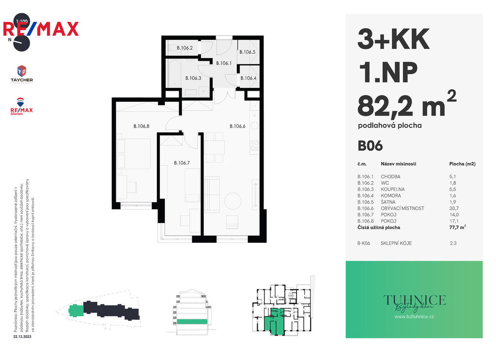 Nabízíme byt 3+KK o celkové ploše 86,22, který se nachází ve 1.NP. Byt disponuje velkou vstupní chodbou s možností umístění vestavných skříní. Stejně jako v ostatních bytech je WC odděleno od koupelny. Tento byt má velkoryse řešenou obytnou místnost s kuchyní o ploše 30,54 m2. Ložnice má 17,07 m2 a je v ní poměrně dlouhá stěna ideální k postavení velké vestavné šatní skříně.V přiloženém půdorysu máte možnost si prohlédnout dispozici bytu, která odpovídá všem moderním standardům. Byt bude standardně vybaven dřevěnou podlahou a v koupelně a WC velkoformátovou moderní dlažbou. Finální materiály je možno samozřejmě s developerem individuálně řešit.