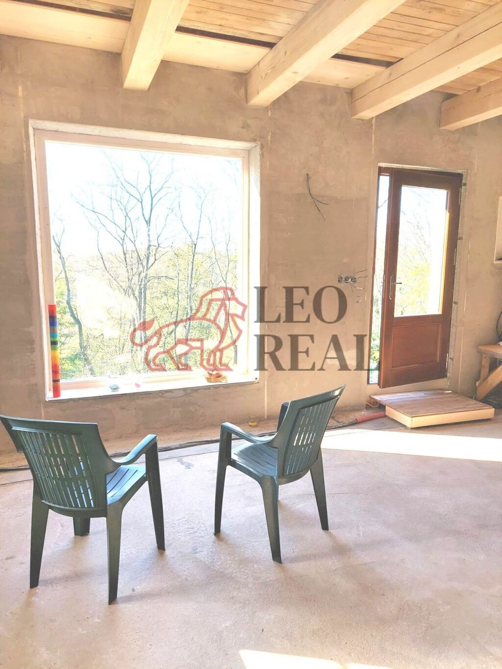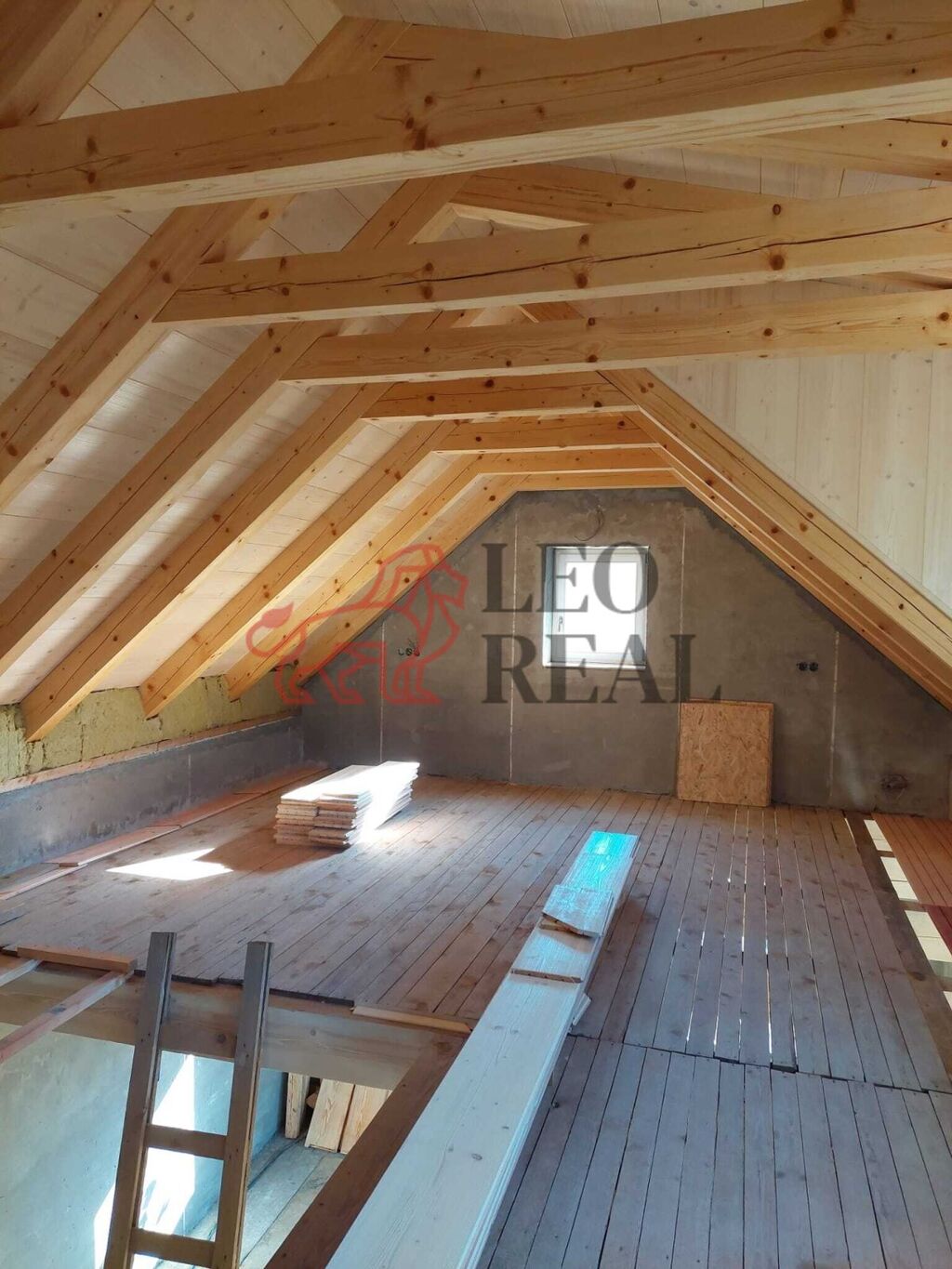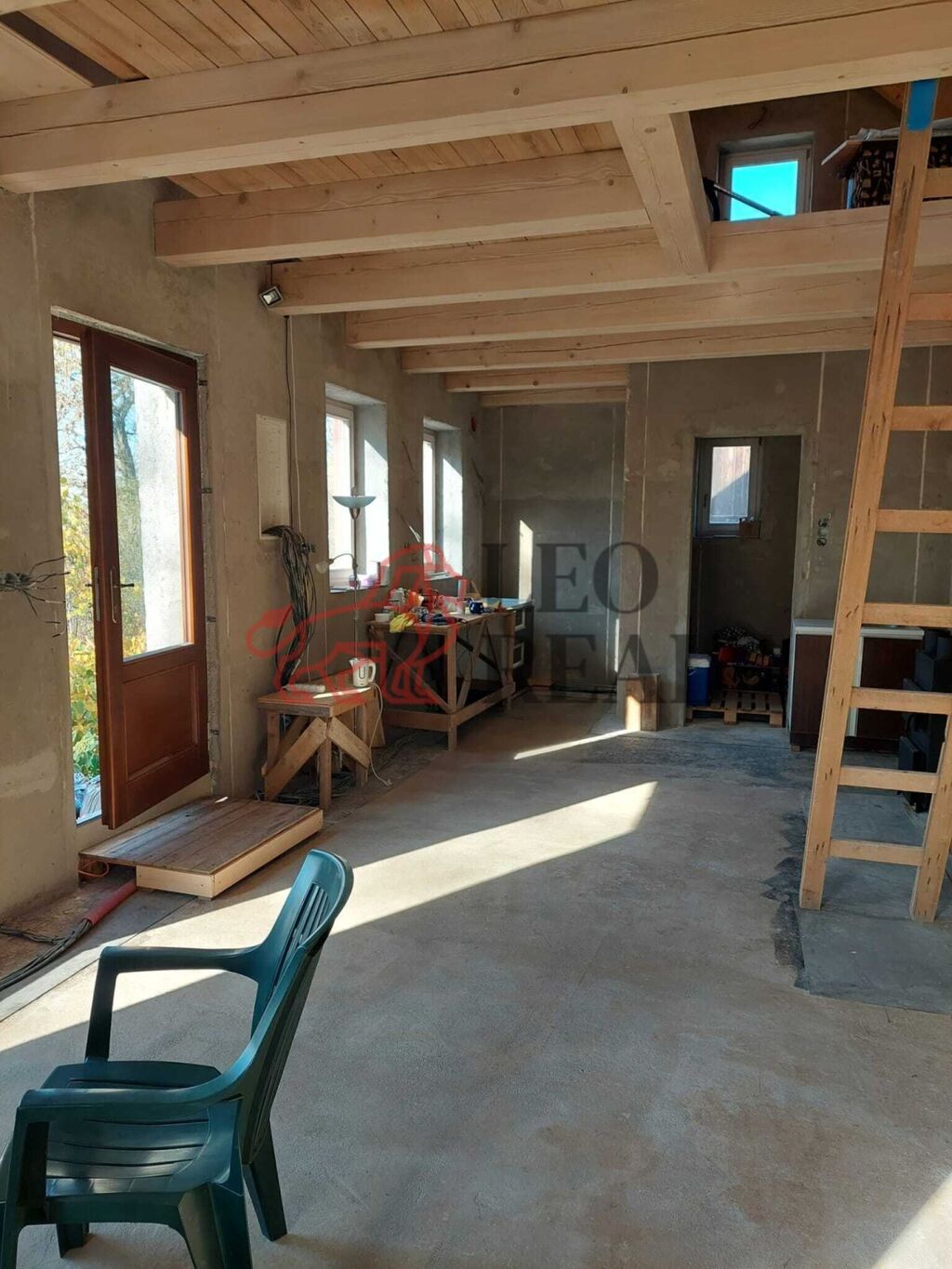 Stavba je postavena z porothermu, má dřevěné pohledové stropní trámy, dřevěnou pohledovou konstrukci stropu v podkroví z drásaných fošen, izolaci střechy 30cm minerální vlny a střešní krytinu bramac (bobrovka) s okapy, příčku oddělující technickou místnost, komín, dřevěná okna a vstupní dveře. V domě jsou rozvody vody, elektřiny a odpadu, vodovodní a elektropřípojka jsou součástí pozemku. V obci není vybudována kanalizace, v PD je plánován septik. Plánováno je topení dřevem (tuhá paliva) s akumulační pecí, případně lze upravit pro krbová kamna, nebo změnou PD na jiný druh vytápění. Teplá voda je plánována instalací el.bojleru, a společně s WC, pračkou, umyvadlem se sprchovou hadicí budou součástí technické místnosti. Sprchový kout je zděný a je řešen samostatným koutem spolu s umyvadlem jako součást hlavní místnosti. V plánu je velký kuchyňský kout ve tvaru L. Podkroví je v PD plánováno pro využití jako velké úložné prostory.