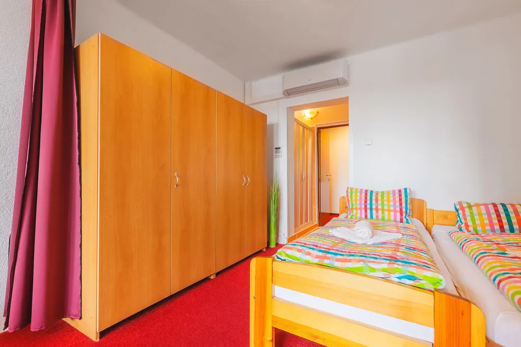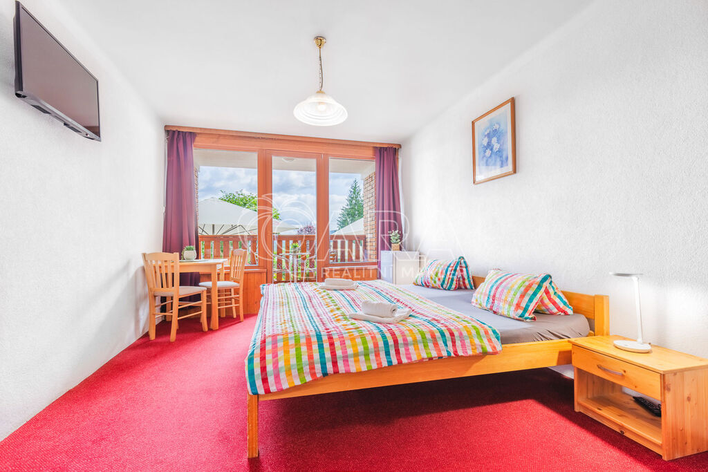 Stávající dispozice umožňuje ubytování až pro 64 hostů ve 15 stejných čtyřlůžkových pokojích, každý s vlastním sociálním zázemím a balkonem orientovaným do krajiny. Součástí areálu je také samostatný apartmán, který je nyní využíván pro personál, ale lze jej jednoduše upravit pro další hosty. Celková užitná plocha objektu přesahuje 1 200 m², parkovací plocha pojme přibližně 20 automobilů a celý areál působí čistě, udržovaně a připraveně k provozu.
