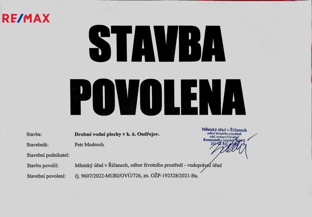 Veškeré vyjadřovačky (a nebylo jich málo) jsou hotové, stačí sednout do bagru a rybník si vybudovat. Dle projektu není potřeba žádný materiál odvážet či likvidovat. Stavební povolení je platné!
