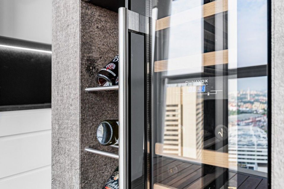 Vybavení zahrnuje kompletně vybavenou kuchyňskou linku Hanák v bílém lesklém designu s vestavěnými spotřebiči Miele včetně vinotéky, vestavěné šatní skříně Poggenpohl. Luxusní dřevěné podlahy v obývacím pokoji s kuchyní, v ložnicích koberce, v koupelnách carrarský mramor, velkoformátová dlažba v dekoru mědi a zařizovací předměty značky  Villeroy  and  Boch. Osvětlení v celém bytě a exteriérové žaluzie na dálkové ovládání, plus klimatizace.