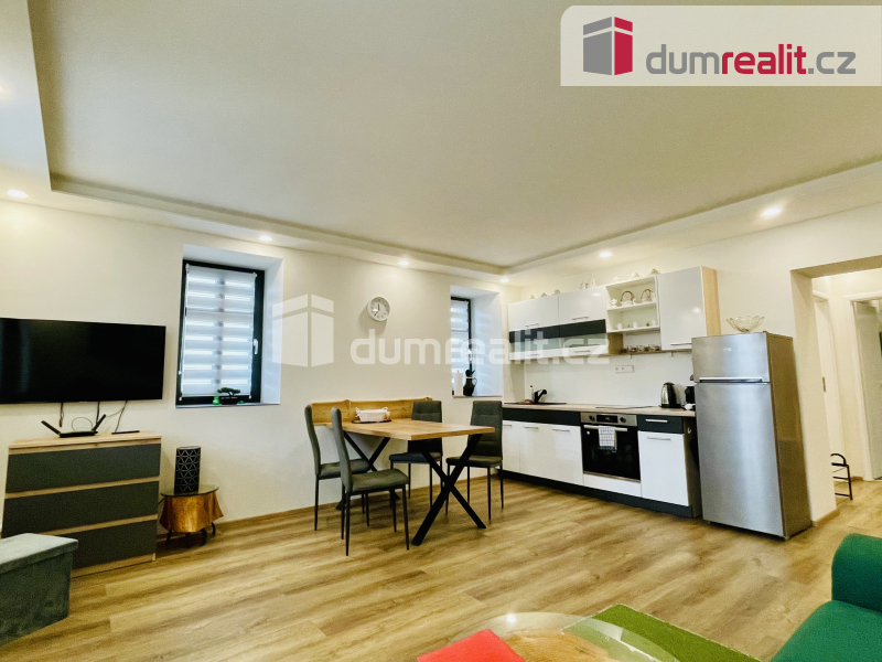 Dumrealit.cz Vám zprostředkuje prodej tohoto krásného  apartmánu, který je v bytovém domě v krušnohorském středisku Abertamy, v původní, zastavěné části města. Jedná se o apartmán v přízemí domu, který byl nově komplexně  zrekonstruován a vybaven. Dispozice bytu je 2+KK o velikosti 46,4 m².  Celoplošné podlahové vytápění a ohřev vody je zajištěno vlastním elektrokotlem. Apartmán je vhodný pro   4 osoby.   Součástí ceny  bytu je  jeho vybavení. K bytu náleží také uzamykatelná sklepní kóje o velikosti 1,7 m².  Společné parkování pro všechny vlastníky ve dvoře.