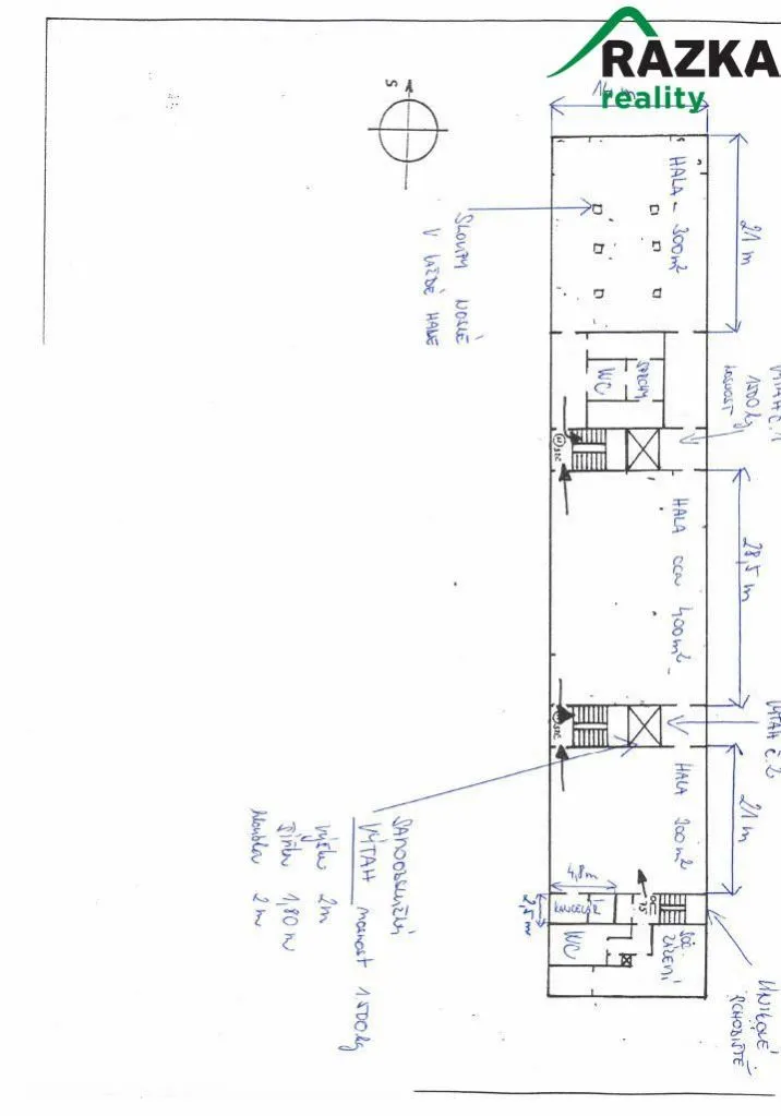 Ve 2.NP: hala 300m2 + 400m2 + sociální zázemí.