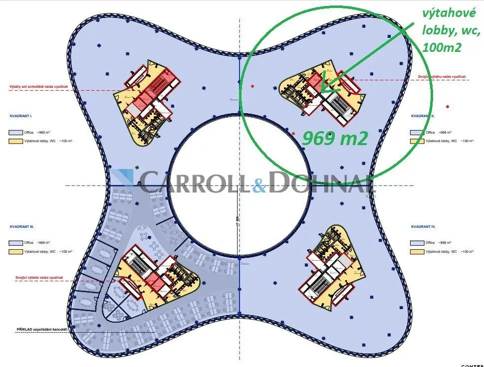 Nabízené prostory se nacházejí ve 2.NP budovy a jsou rozděleny dle tvaru budovy na 4 segmenty (kvadranty), každý o velikosti 969 m2, je možné pronajmout 1,2,3 nebo všechny 4 segmenty.