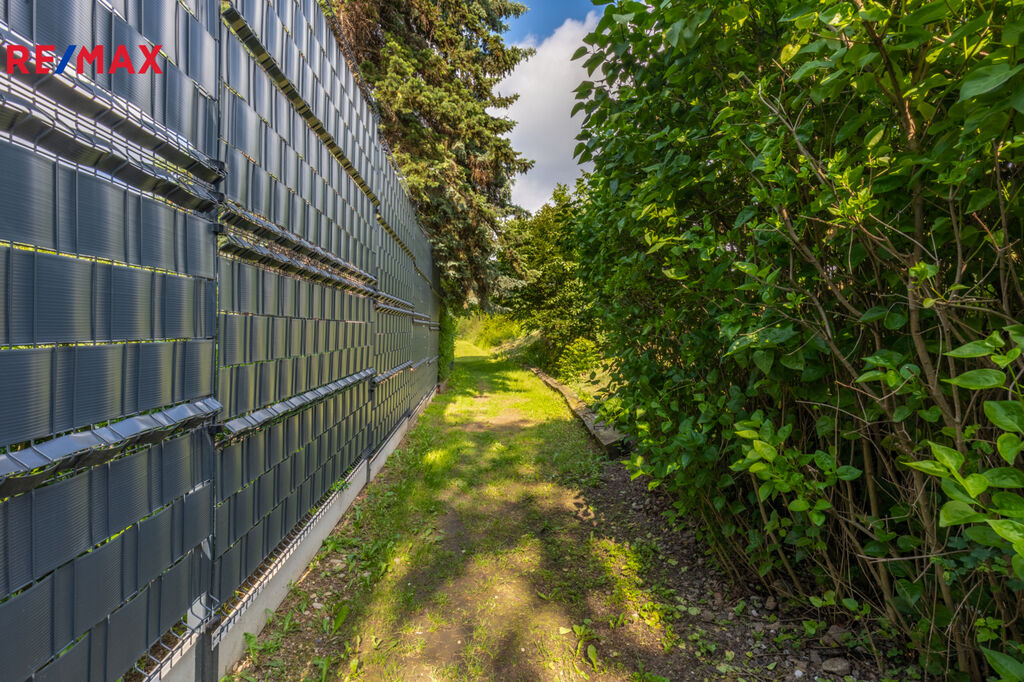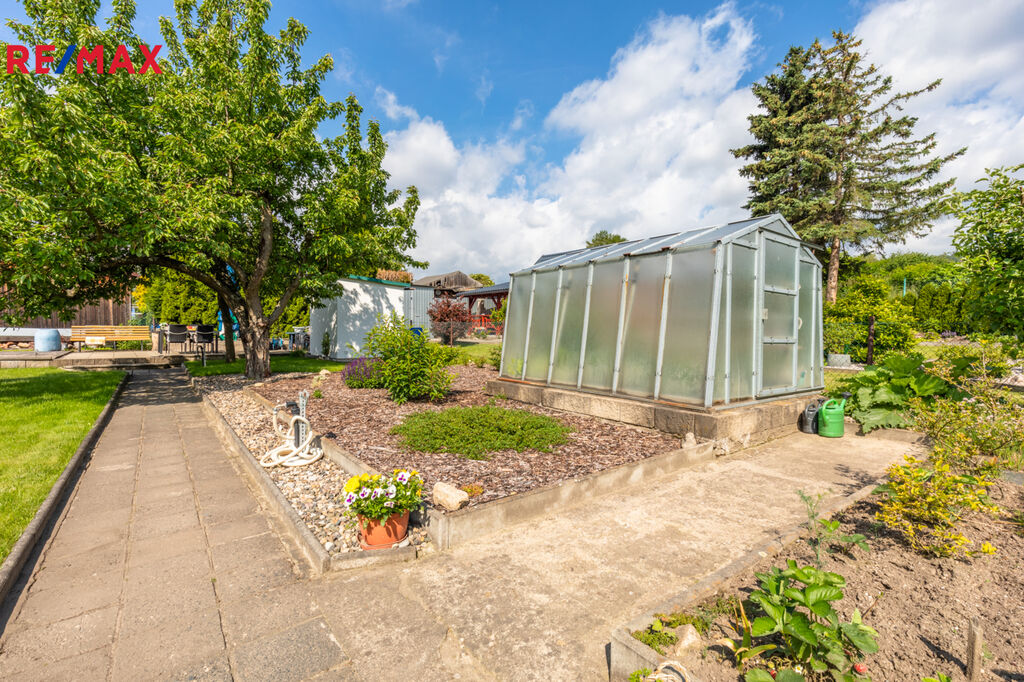 Zahrada je ideální nejen pro rekreaci a každodenní relaxaci celé rodiny, ale také pro nadšené pěstitele. Skleník o rozměrech 3 x 2,5 m ocení každý zahrádkář. Na zahradě rostou okrasné keře a plodící ovocné stromy jako třešeň, jabloň, broskvoň a slíva. Jsou zde také založené záhonky pro pěstování zeleniny, rajčat a dalších plodin. Zatravněná plocha je pravidelně udržována a opečovávána, což vytváří krásný zahradní koberec. V rohu zahrady se nachází zahradní plastová buňka s chemickým WC.
