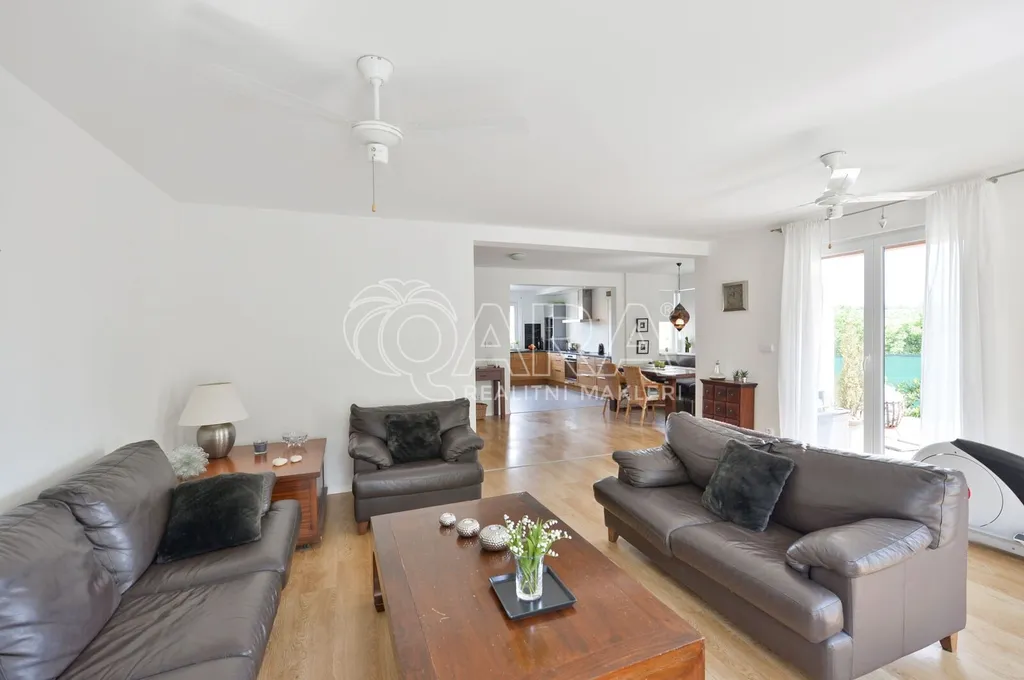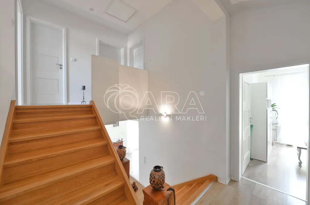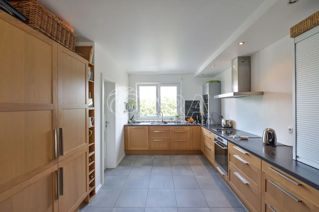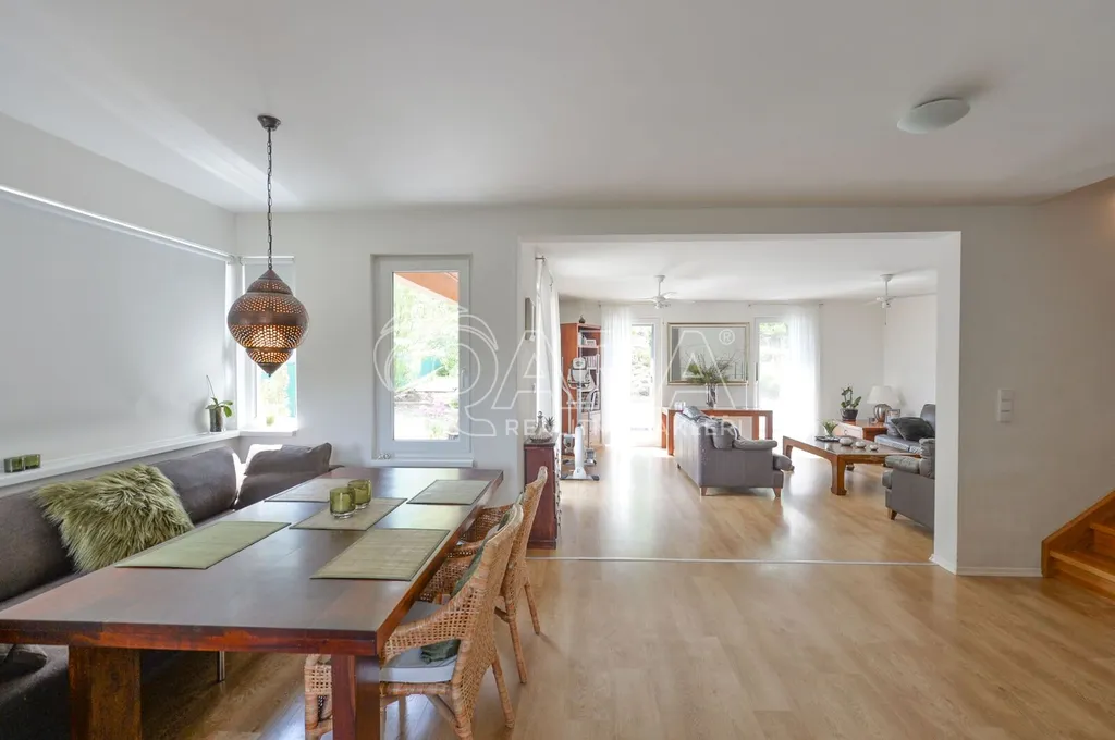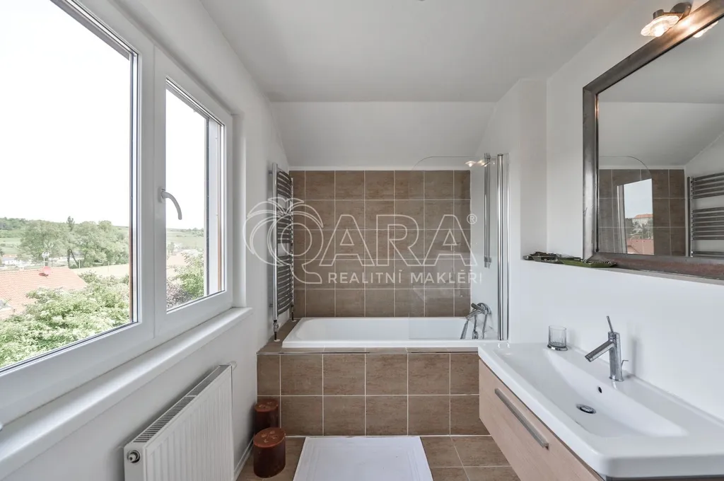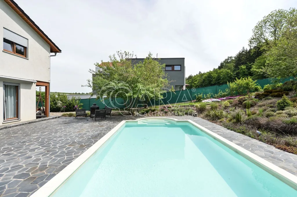 Nabízíme rodinný dům ve vyhledávané obci Tuchoměřice jen pár minut od Prahy 6 a letiště s pozemkem ve svahu navazujícím na les. Dům byl stavěn na klíč v nadstandardním provedením a s množstvím individuálních úprav. Kolaudace proběhla v roce 2009. V přízemí se nachází velkorysý obytný prostor spojený s jídelnou a kuchyní, u kuchyně je spíž. Moderní kuchyňská linka je kompletně vybavena vestavěnými spotřebiči. Z obývacího pokoje je výstup přímo na terasu s bazénem před domem. V mezipatře se nachází dva pokoje a prostorná koupelna se sprchovým koutem a toaletou. Ve druhém patře jsou tři ložnice, z nichž každá má vlastní koupelnu. Také je zde šatna a technická místnost s místem pro pračku a sušičku. Na podlahách jsou kvalitní laminátové plovoucí podlahy, dlažba a schodiště jsou dřevěná. Vytápění je řešeno plynovým kotlem, který je umístěn v suterénu vedle garáže. Na zahradě byl vybudován bazén o velikosti 8x4 m. Obec Tuchoměřice nabízí základní občanskou vybavenost. V místě je pošta, lékaři, mateřská škola a první stupeň základní školy. Přes obec vede cyklostezka. Bezproblémové je i spojení MHD na metro A Bořislavka 25 min. Letiště Václava Havla 10 min.
