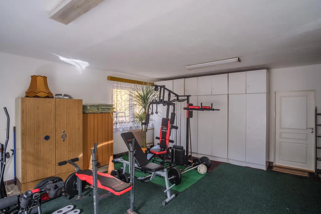 Dům disponuje menší předzahrádkou, za domem posléze naleznete opravdu prostorné nádvoří, kde lze zaparkovat několik osobních vozů. K domu navíc náleží ještě menší zadní domek, který má u sebe dvougaráž a v horním patře pak samostatnou bytovou jednotku v dispozici 2+kk o podlahové ploše cca 66 m2. Navíc je vedle tohoto menšího návštěvního domku také druhá přístavba, další garáž pro osobní vůz. Na pozemku naleznete navíc také posezení pro letní grilování, psí kotec a také zhruba 5metrový krytý bazén.