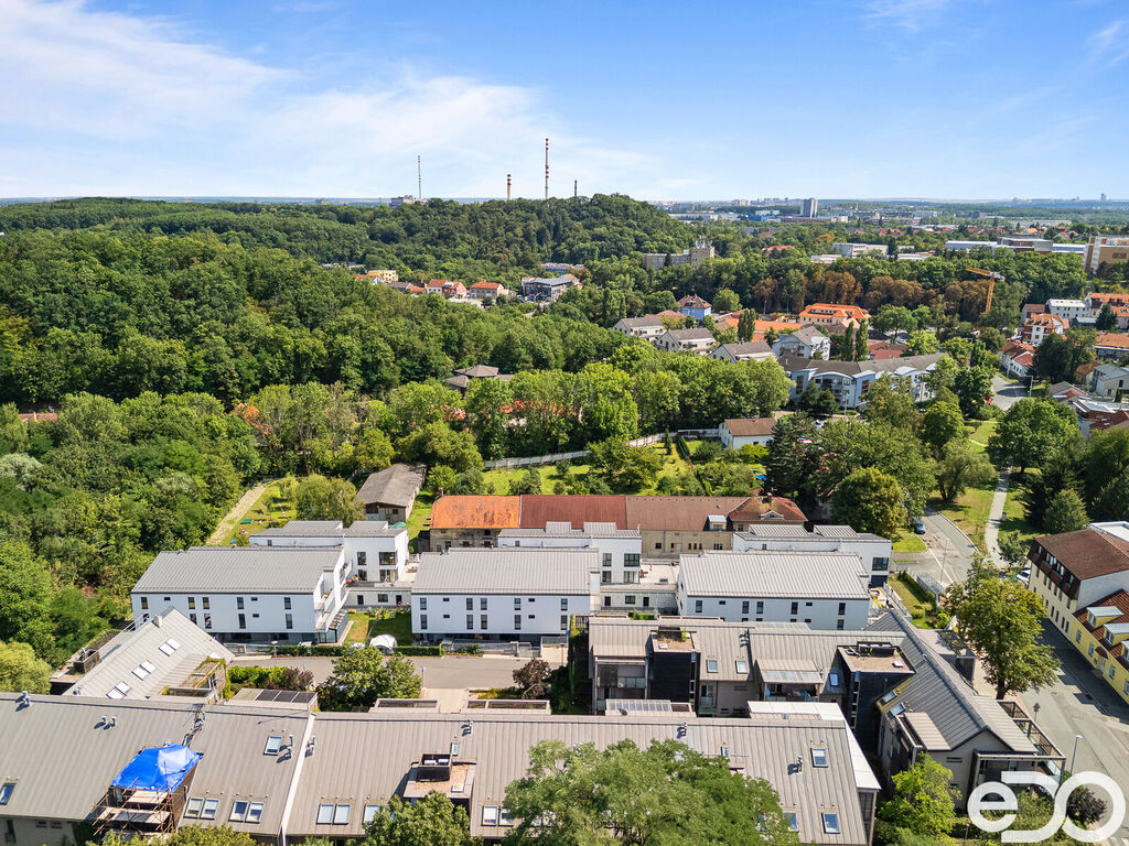 Díky velkým oknům působí byt velmi vzdušně a prostorně a zároveň máte výhled na celou zahradu, která patří k těm větším. Parkovací stání je umístěno v suterénu budovy a velkou výhodou je vlastní sklepní koje, které nebývá u novostaveb pravidlem.
