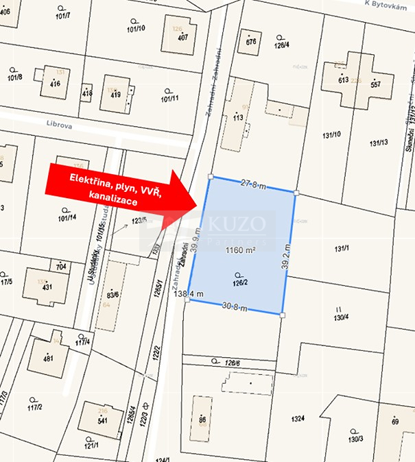 Pozemek je napojen na elektřinu, veřejný vodovodní řad a plyn. Kanalizace je k dispozici ihned na hranici pozemku v přilehlé komunikaci.