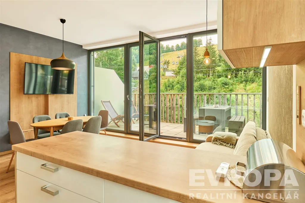 Nabízím k prodeji luxusní horský apartmán s dispozicí 2+kk o rozloze 62 m² s prostornou terasou 29 m² s elektrickými venkovními žaluziemi na dálkové ovládání v prestižní rezidenci Rotterovka v Hořejším Vrchlabí. Součástí apartmánu je kryté parkovací stání a sklepní kóje vybavená jako lyžárna.