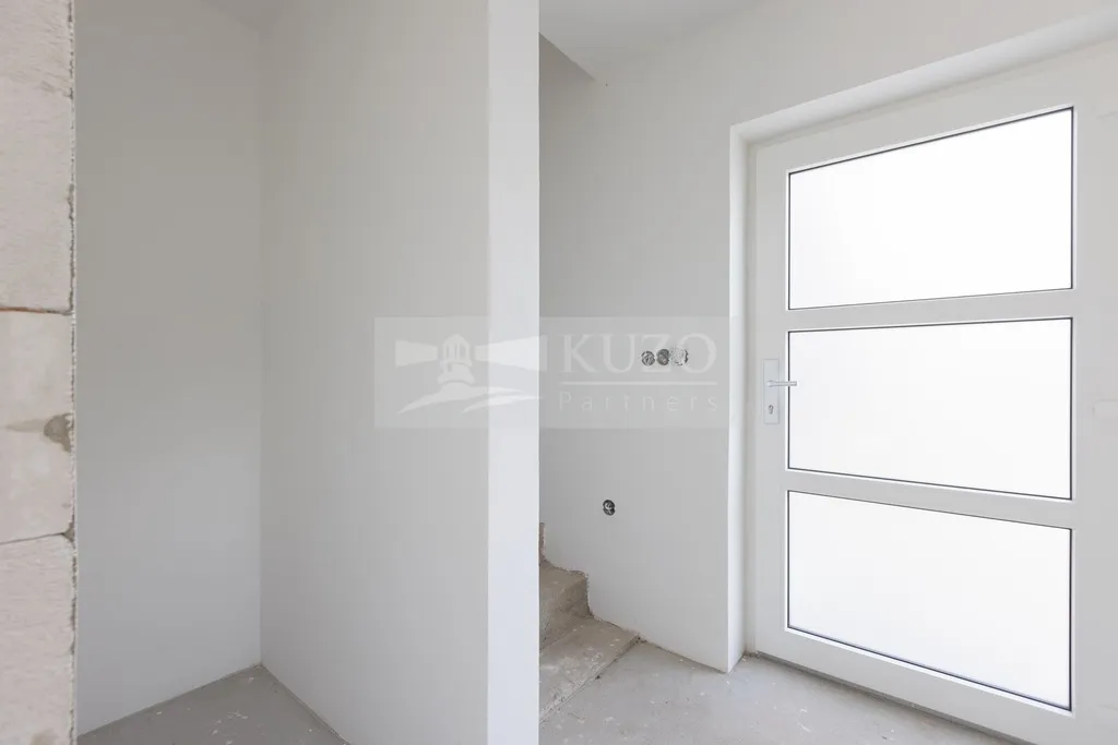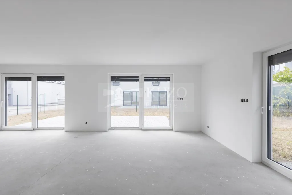 V přízemí přes vstupní předsíň se nachází prostorný obývací pokoj s kuchyňským koutem o výměře skvělých 43 m2, dále koupelna se sprchovým koutem a toaletou, technická místnost a prostorná garáž o výměře téměř 29 m².