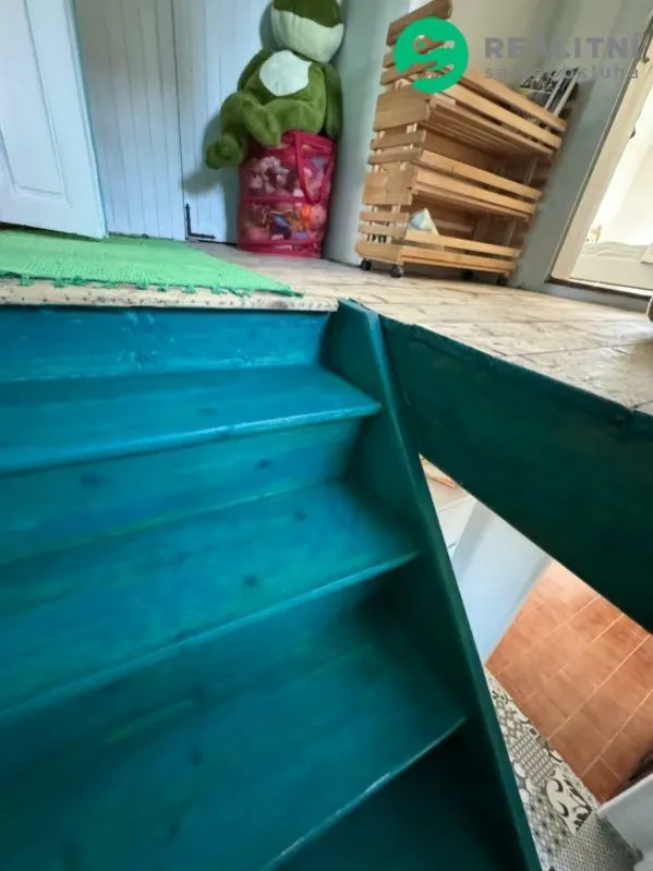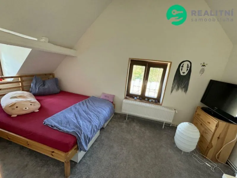 V patře jsou dvě ložnice, menší prostor nad schody a vstup na půdu.