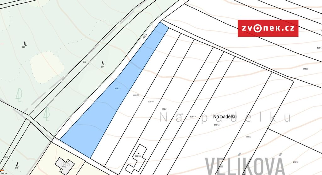 v klidné části obce Velíková, která je částí města Zlín. Pozemek má celkovou výměru 3587m2 a je určený pro klienty, kteří chtějí mít krásný velký pozemek s celodenním sluncem. Nachází se v již vybudované ulici Borovicová na jejím konci jako poslední pozemek u lesa, tím zaručuje naprosté soukromí a klid ke spokojenému bydlení. Příjezd po asfaltové komunikaci, inženýrské sítě na hranici pozemku - vodovod, elektřina, kanalizace.