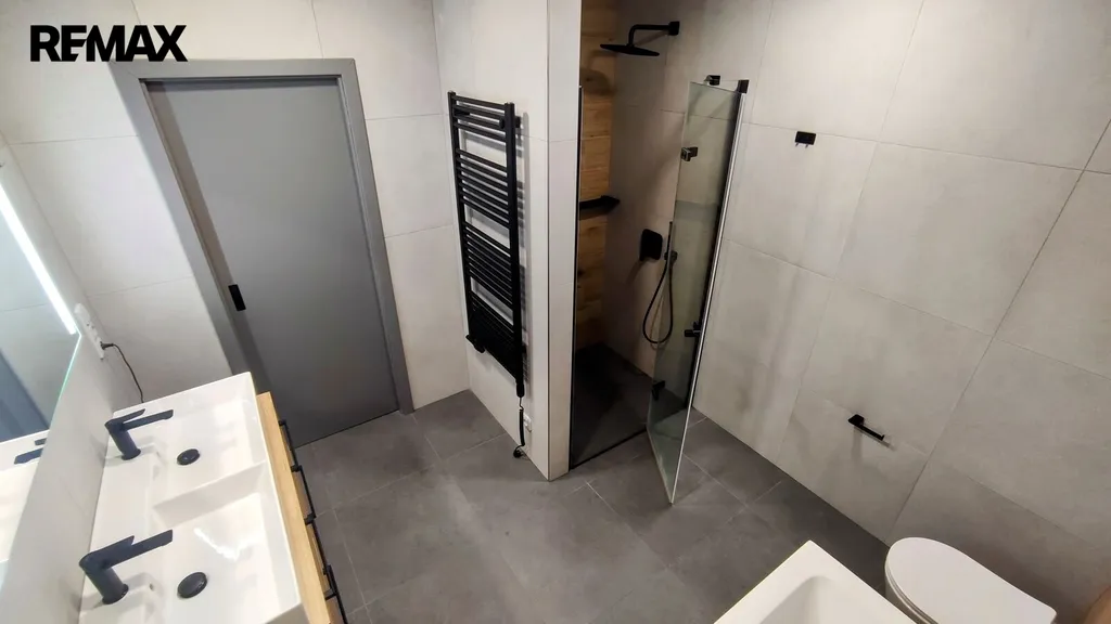Byt je tvořen obývacím pokojem s jídelním a kuchyňským koutem vybaveným rohovou kuchyňskou linkou a ostrůvkem s velkým množstvím úložného prostoru, vestavěnou elektrickou troubou, mikrovlnou troubou, indukční varnou deskou, myčkou a vestavěnými skříněmi. Obývací pokoj je propojený s jídelnou a kuchyní v jednu velkou místnost, ze které vede vstup na prostornou terasu orientovanou na jihozápad, poskytuje prostor pro maximální rodinnou pohodu. Koupelna se sprchovým koutem a prostornou rohovou vanou, WC a žebříkovým radiátorem je dále vybavena dvěma umyvadly s vlastními skříňkami a velkým zrcadlem. Předsíň propojující všechny místnosti vede dále do dvou pokojů s okny orientovanými do zahrady směrem na severovýchod, tak aby byl dosažen maximální klid při regeneraci a spánku. Vytápění a ohřev vody je zajištěn plynovým kotlem umístěným v přízemí RD, který je společný pro oba byty.