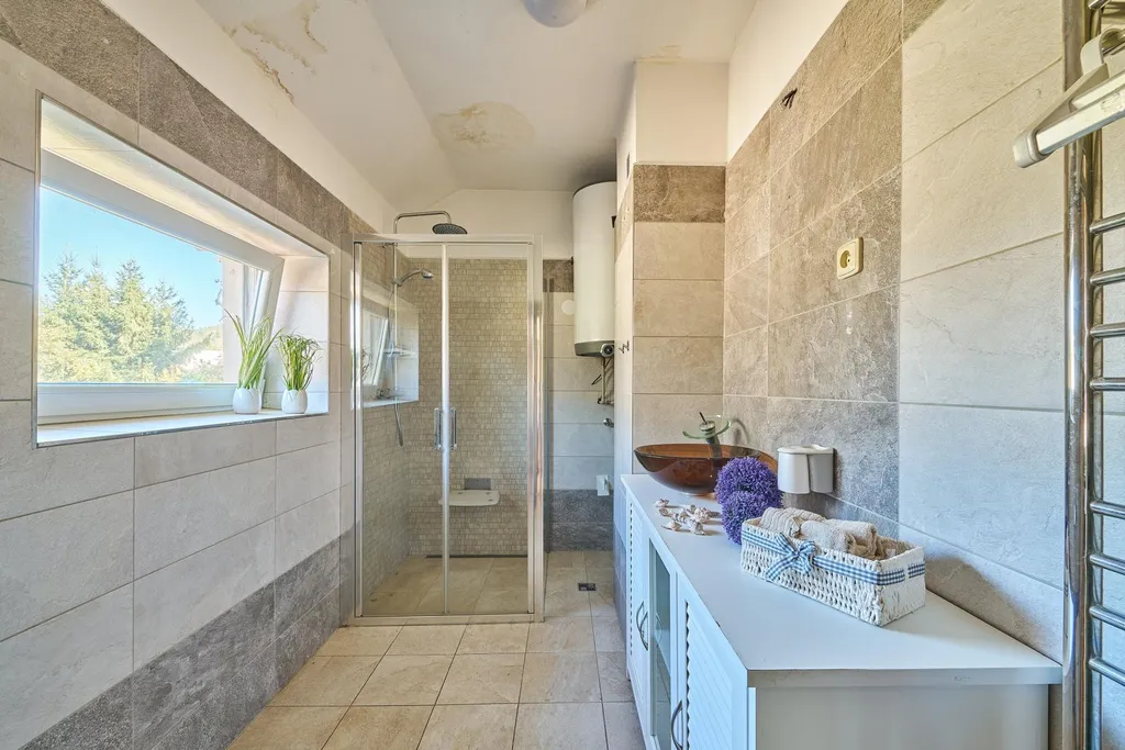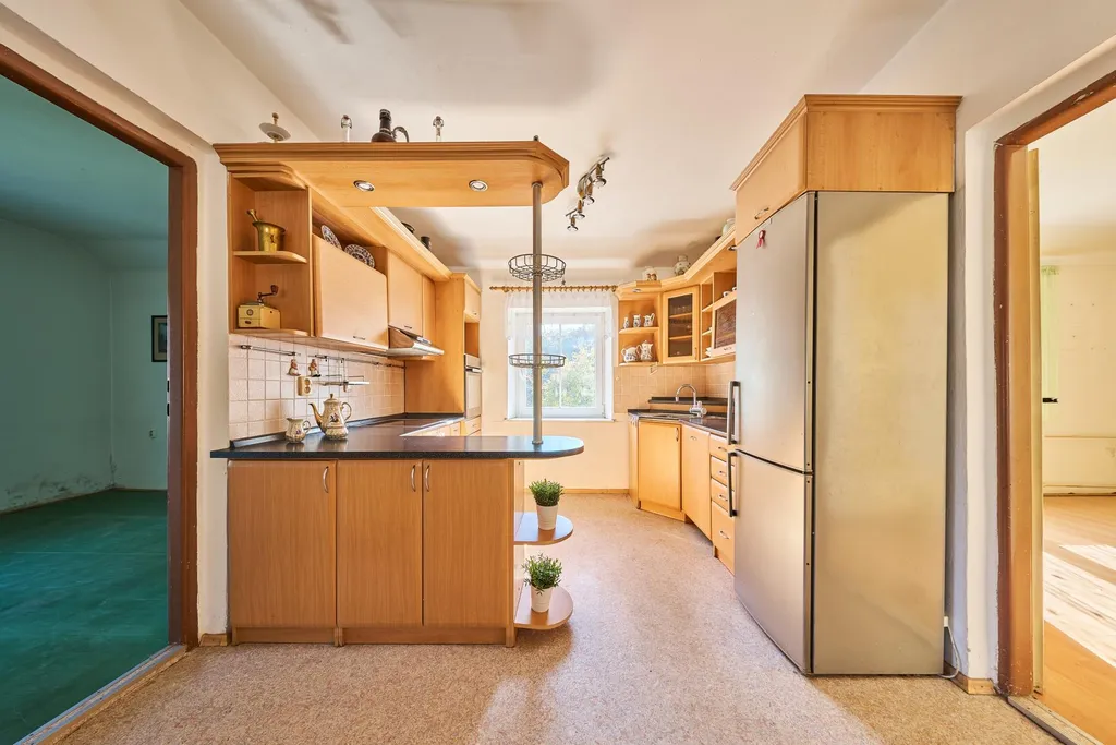 Do bytové jednotky se vstupuje po schodišti ze společné verandy a chodby. Kuchyně je vybavena kuchyňskou linkou s myčkou, lednicí s mrazákem a dalšími spotřebiči. Vlevo od kuchyně je jeden pokoj a vpravo pak další dva pokoje. Celá bytová jednotka má plastová okna s dvojskly, je bez vybavení nábytkem a po vymalování je připravena k okamžitému nastěhování a bydlení. Koupelna s WC prošla v nedávné době kompletní rekonstrukcí. K této bytové jednotce přináleží terase po celé délce domu a garáž na jedno vozidlo s dílnou o výměře 32,4 m2. V podílovém spoluvlastnictví pak je další prostorná dílna, půda a další prostory domu včetně pozemků. Je zde i možnost převzetí pronájmu další zahrady vedle domu. Lze současně realizovat koupi dalšího bytu 3+1 v 1. NP a vlastnit celý dům. Do budoucna se jeví jako vhodné investovat do zateplení pláště budovy, popř. využití dalších prostor na přestavbu a vznik další bytové jednotky.