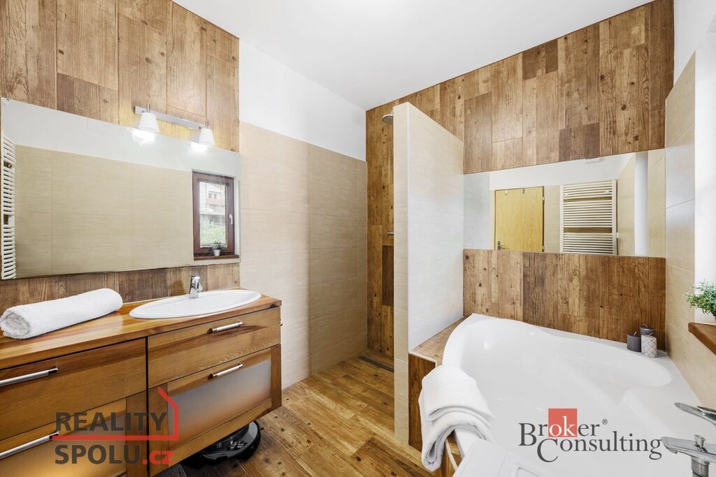 Přístavba disponuje dalšími nebytovými prostory, velkou místností (možnost vytápění krbovými kamny), koupelnou včetně WC a elektrickým bojlerem, v suterénu prostornou dílnou, vodárnou a skladovacími prostory. Je napojena na kanalizaci a vodu ze studny.
