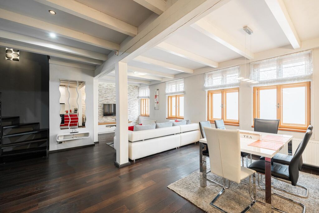 Dominantou bytu je otevřený obývací pokoj s jídelním koutem a s kuchyní s vestavnými spotřebiči. Z obývacího pokoje je vstup do ložnic po schodech v patře. Ložnice jsou oddělené a poskytují tedy soukromí. Byt poskytuje prakticky dvě koupelny. Světlá prostorná koupelna se sprchovým koutem je umístěna v dolní části bytu, s umyvadlem a wc. Druhou toaletu nalezneme i ve druhé koupelně, kde se nachází vana i bidet.