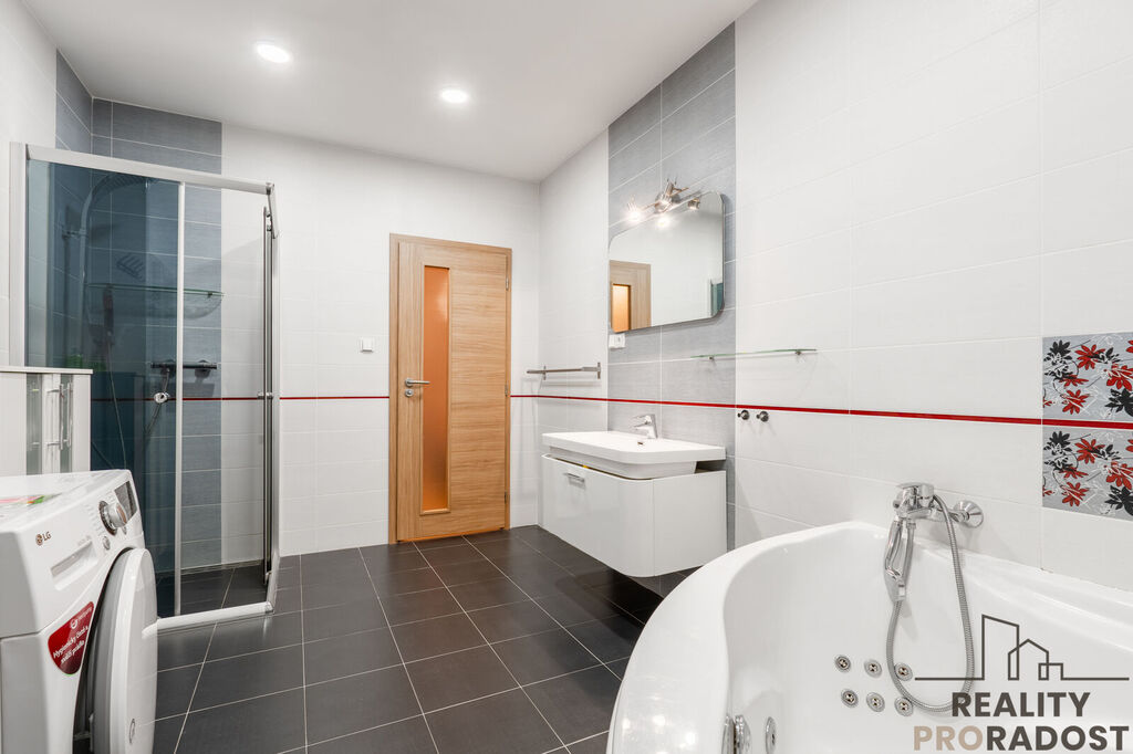 Stylová koupelna s rohovou vanou i sprchovým koutem, kde si můžete dopřát zasloužený odpočinek.