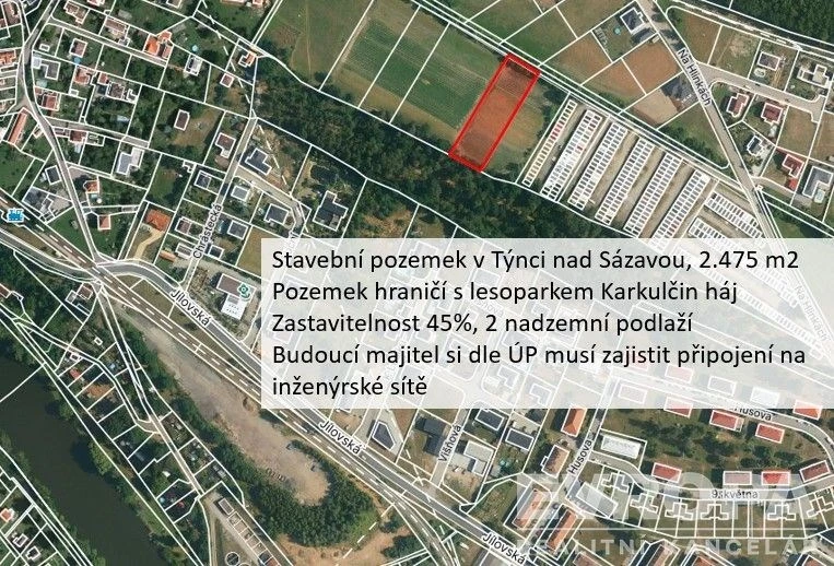 Týnec nad Sázavou je i díky zlepšení dopravní dostupností (dostavba D3) jedním z rychle se rozvíjejících měst. Rezidenční charakter a klidné prostředí vhodné pro rodiny s dětmi nebo pro ty, kteří hledají útočiště před ruchem velkých měst. Pozemek zaručuje i v budoucnu dostatek klidu jedinečná stezka lesoparkem tzv. Karkulčin háj, vede přímo pod tímto pozemkem krásné místo s venkovním fitness a dětským hřištěm.