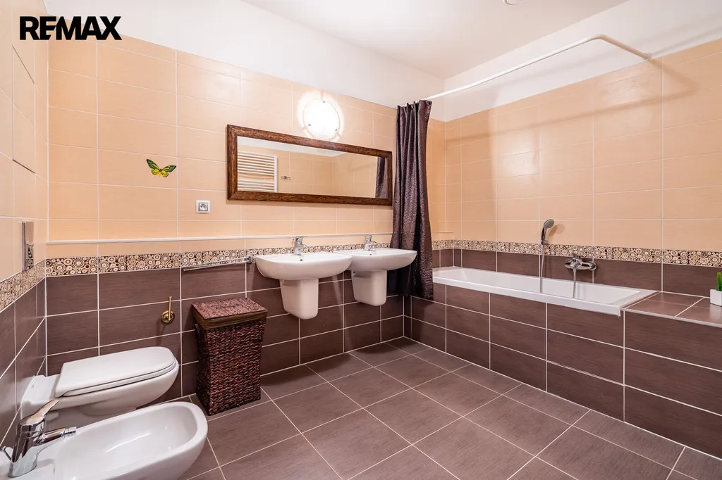 Byt je vybaven moderní koupelnou s kvalitními zařizovacími prvky a dvěma samostatnými toaletami, což ocení zejména vícečlenné domácnosti. Celý interiér je kompletně zařízen, což znamená, že si stačí přinést osobní věci a můžete se ihned nastěhovat. Nábytek i spotřebiče jsou pečlivě vybrané tak, aby odpovídaly současným trendům a poskytovaly maximální funkčnost i estetiku.