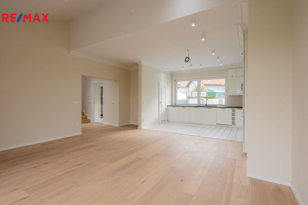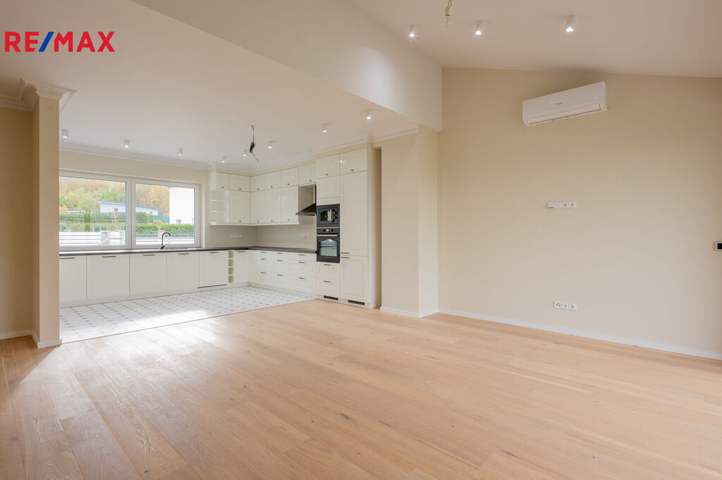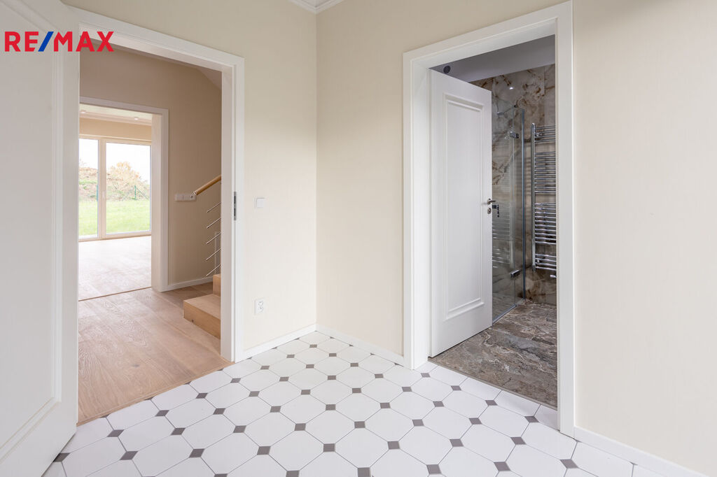 Vstupte do domu, který vás přivítá svou vzdušností a teplem. Srdcem přízemí je prostorný obývací pokoj propojený s moderní kuchyní. Tento otevřený koncept vytváří ideální místo pro setkávání s rodinou i přáteli. Kuchyně je vybavena špičkovými vestavěnými spotřebiči, které zpříjemní každodenní vaření, a její součástí je také praktická komora pro uložení potravin a dalších potřeb.