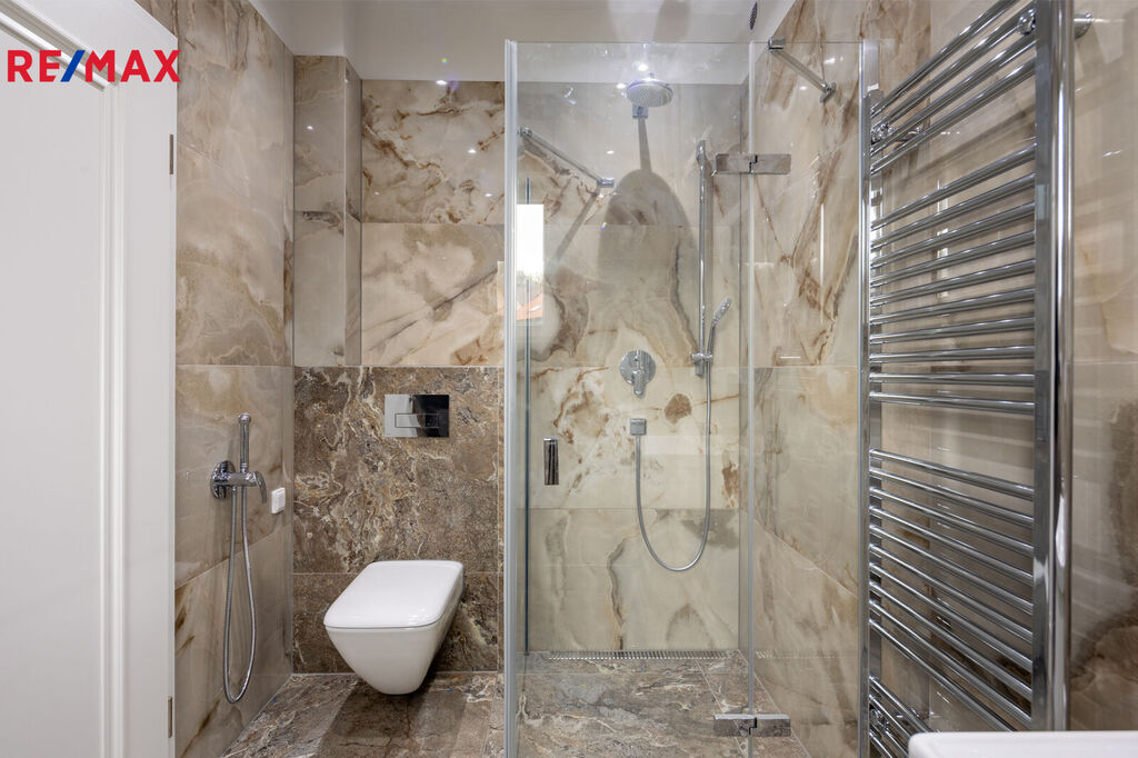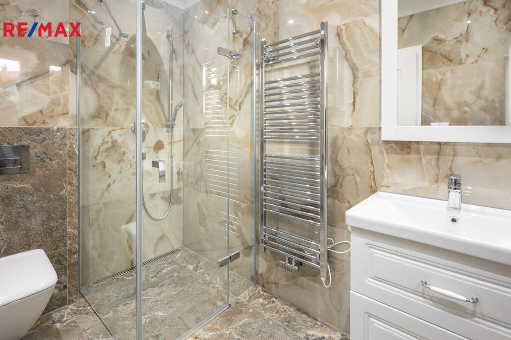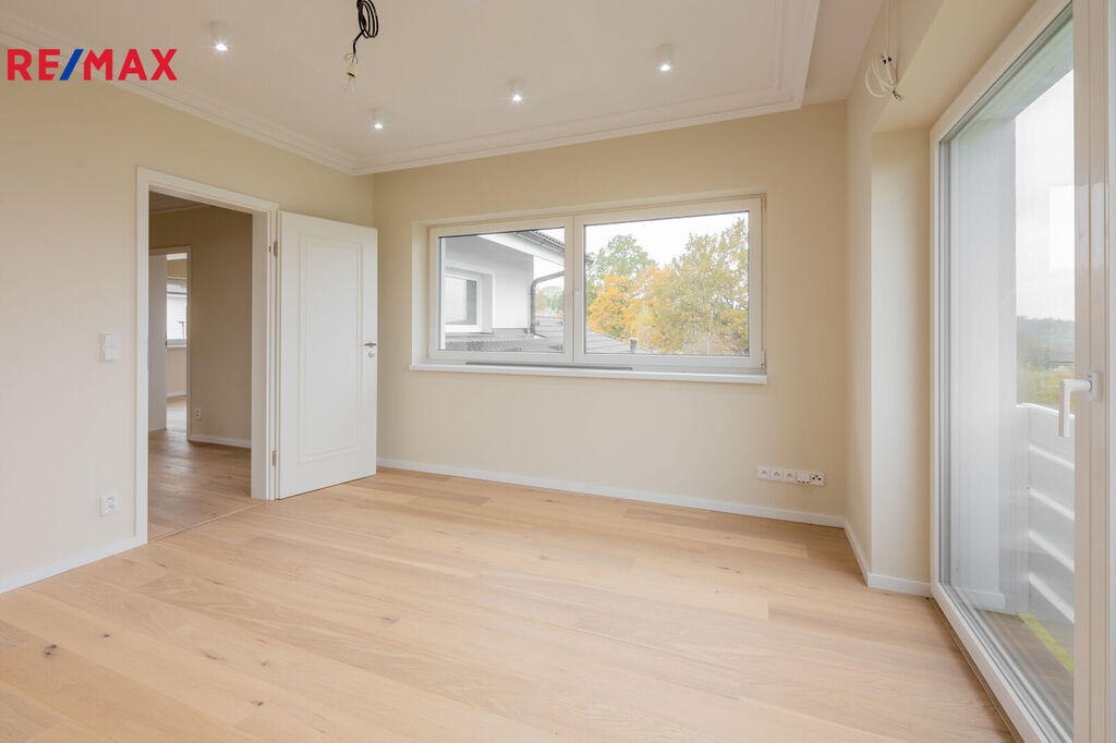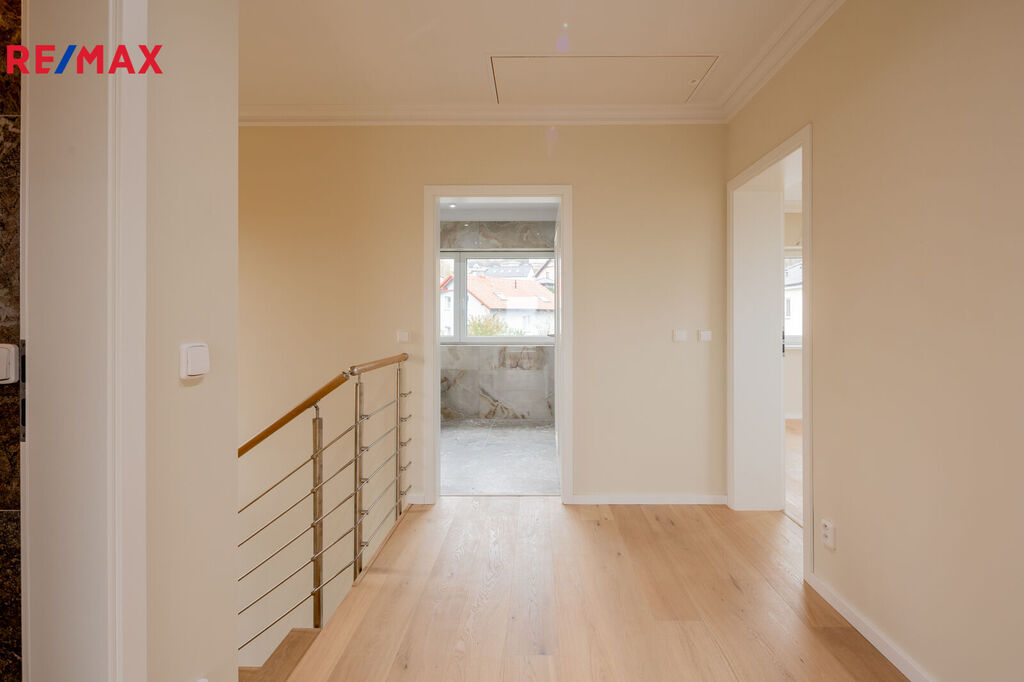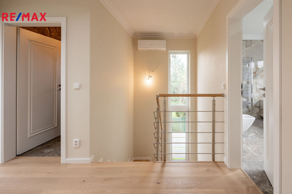 Z obývacího prostoru i ložnice vedou francouzská okna přímo na terasu. Představte si, jak si užíváte ranní kávu na terase nebo večerní relaxaci s výhledem na zeleň – to vše v naprostém soukromí. Na tomto patře je k dispozice pokoj pro hosty a také koupelna s WC.