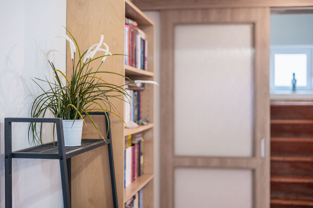 V prvním poschodí domu je pak vstup do domu a menší vstupní chodba, kde hled v levo nalezneme prostor sloužící jako šatna s oknem do ulice. Dále navazuje samostatné wc, koupelna se sprchovým koutem a prostor pro pračku se sušičkou a vstup do centrální prostorné haly, odkud se jde do obývacího pokoje - z něj je pak přímý vstup na terasu a do zahrady domu, do kuchyně s okny do ulice a boku domu a prostorné ložnice s okny do zahrady.