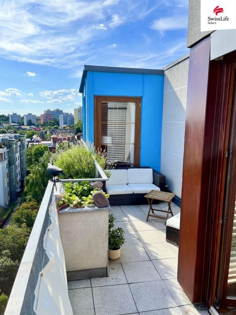Tento byt se nachází v posledním, osmém patře moderního domu a nabízí nejen klidné bydlení, ale i úžasné výhledy a komfortní venkovní prostory.