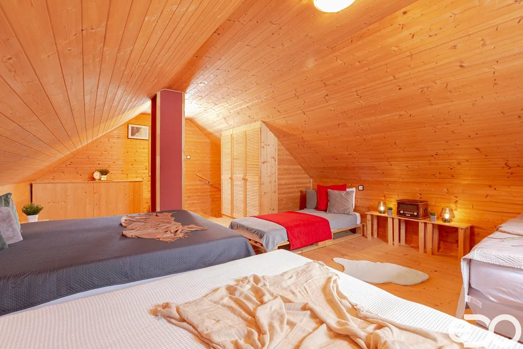 Chata je patrová, se dvěma podlažími, a je ve velmi dobrém stavu. V přízemí se nachází místnost jako kombinace kuchyně s vybavenou kuchyňskou linkou, jídelním stolem a židlemi. Dále slouží i jako prostorná obývací místnost se sedací soupravou a TV. Dále se v přízemí nachází sociální místnost, kde je sprchový kout, umyvadlo a WC. Z přízemí nás vede schodiště do prvního patra, které je nyní využíváno a zařízeno jako místnost pro spaní, kde se pohodlně vyspí až 7 osob. Zastavěná plocha činí 51 m², přičemž užitná plocha je shodná s touto hodnotou, což umožňuje praktické využití každého čtverečního metru. Celková plocha přilehlého pozemku je potom 160 m².