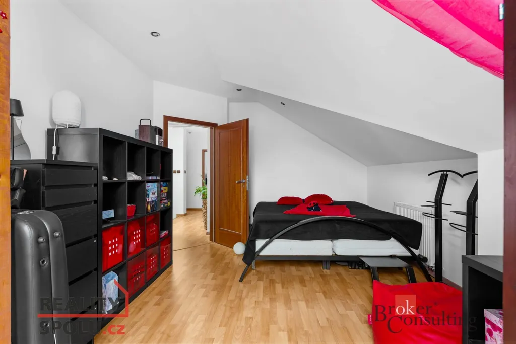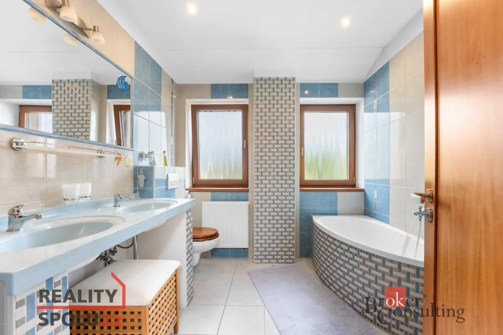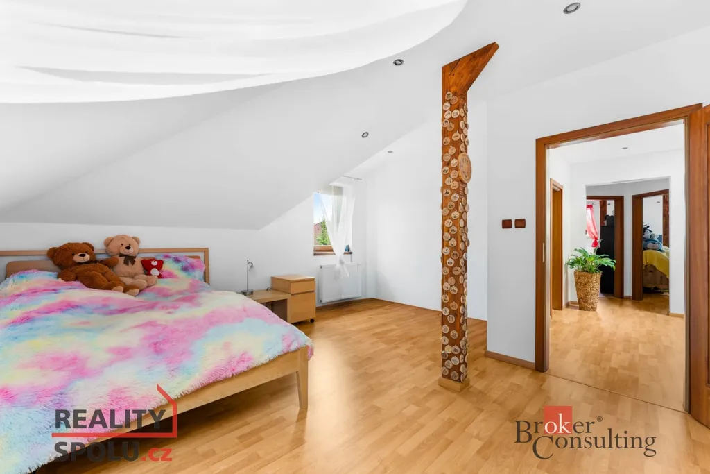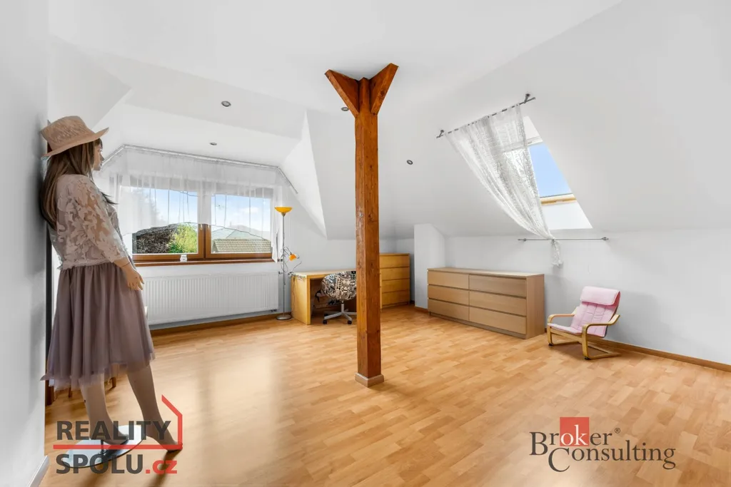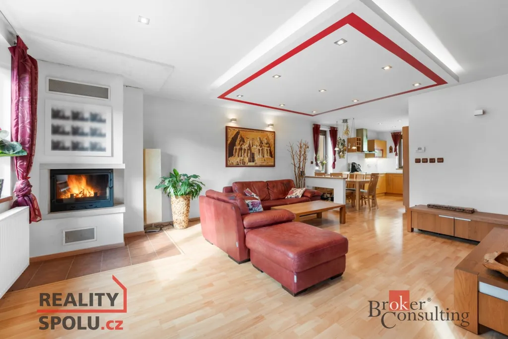 V přízemí se nachází předsíň s velkou vestavěnou skříní a technickou místností, velký obývací pokoj s krbem, plně vybavený kuchyňský kout s jídelní částí, ložnice a moderní koupelna s vanou, sprchovým koutem a samostatnou toaletou. V přízemí je jak podlahové topení, tak radiátorové. V 1. podlaží naleznete 4 pokoje, koupelnu s vanou a toaletou.