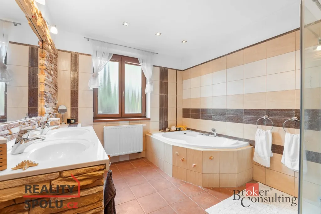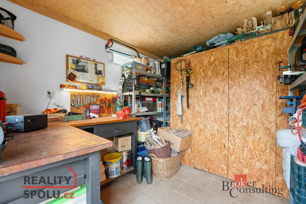 Na okrasné, prostorné zahradě se nachází pergola s krbem, studna, jezírko se skalkou, zastřešený a vyhřívaný bazén, samostatně stojící dílna, parkovací stání a garáž, která je součástí stavby, vše zajištěno zabezpečovacím systémem.