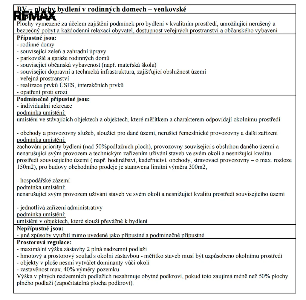Pozemek je dle územního plánu určený pro "bydlení v rodinných domech - venkovské", tedy plochy vymezené za účelem zajištění podmínek pro bydlení v kvalitním prostředí, umožňující nerušený a bezpečný pobyt a každodenní relaxaci obyvatel, dostupnost veřejných prostranství a občanského vybavení.