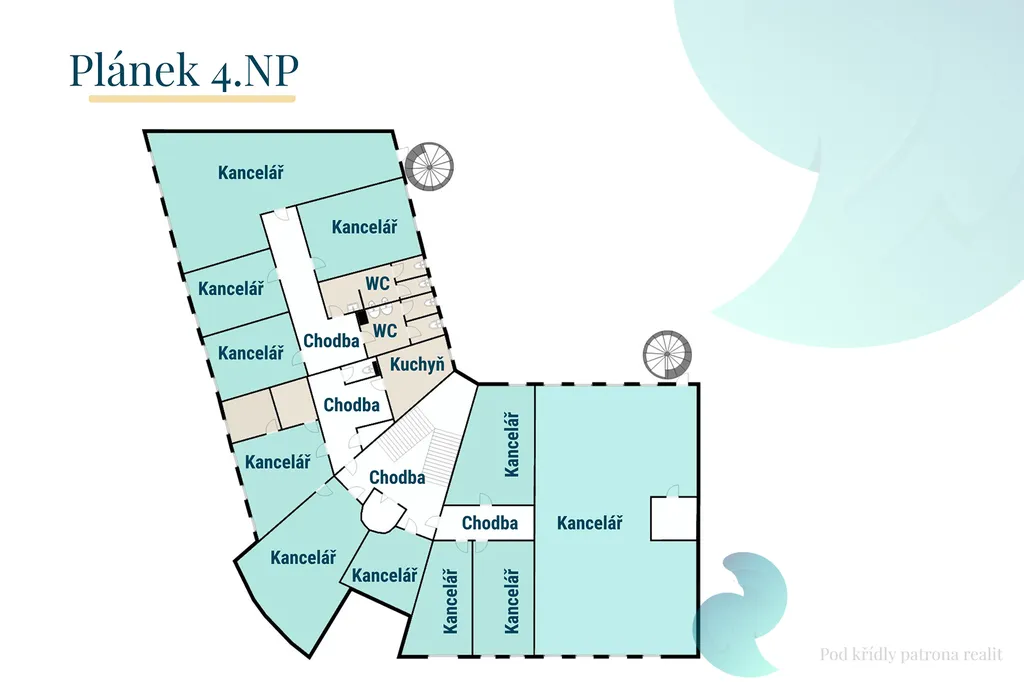 Aktuálně nabízíme pronájem 4.NP o velikosti cca 466 m2 a 5. NP o velikosti 378 m2. V každém patře je k dispozici společná kuchyňka a toalety. Kanceláře lze pronajmout také samostatně.
