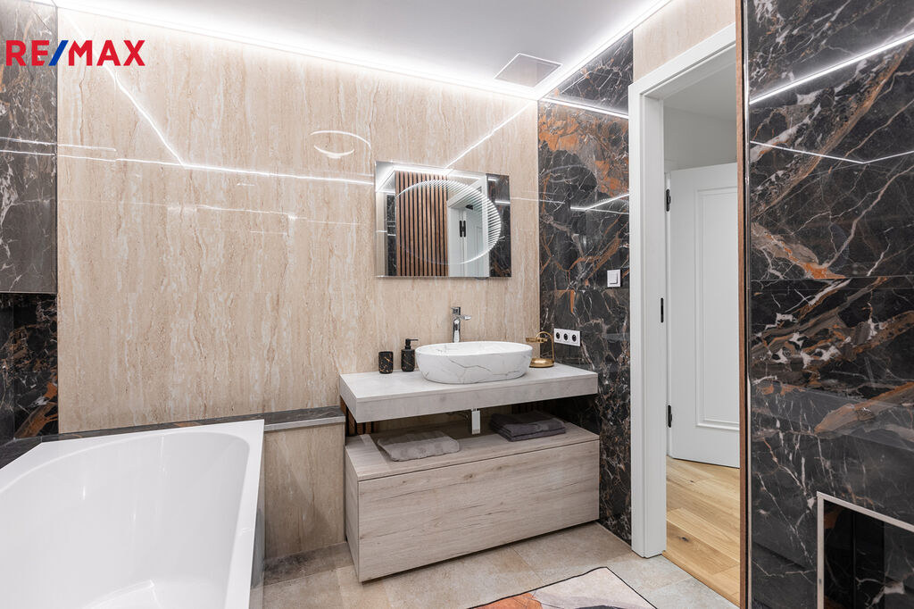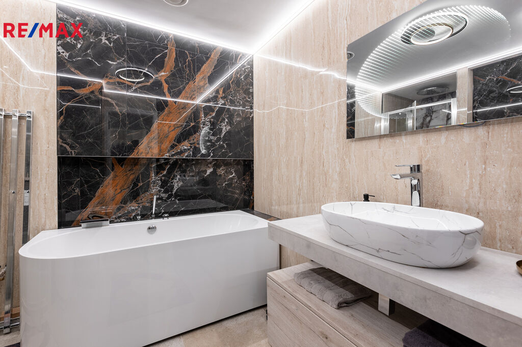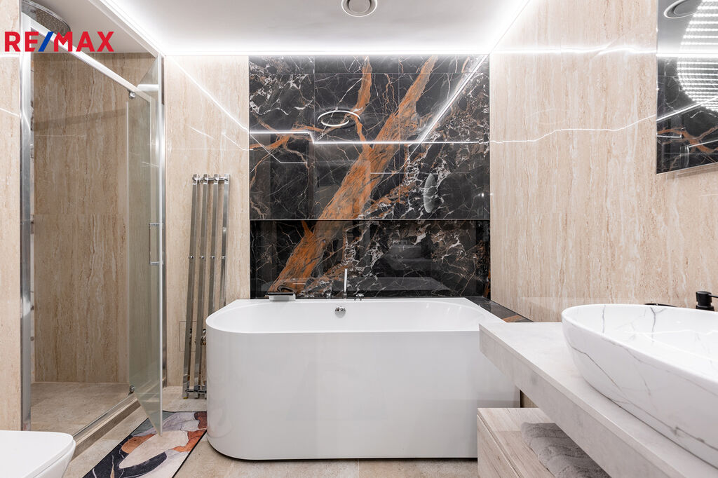 Koupelna je moderní a prostorná, s velkou vanou i samostatným sprchovým koutem, takže si mohu dopřát jak rychlou ranní sprchu, tak dlouhý relaxační večer.