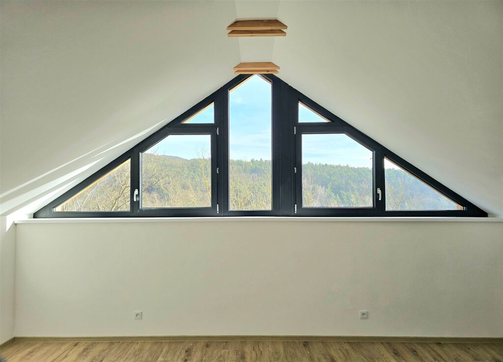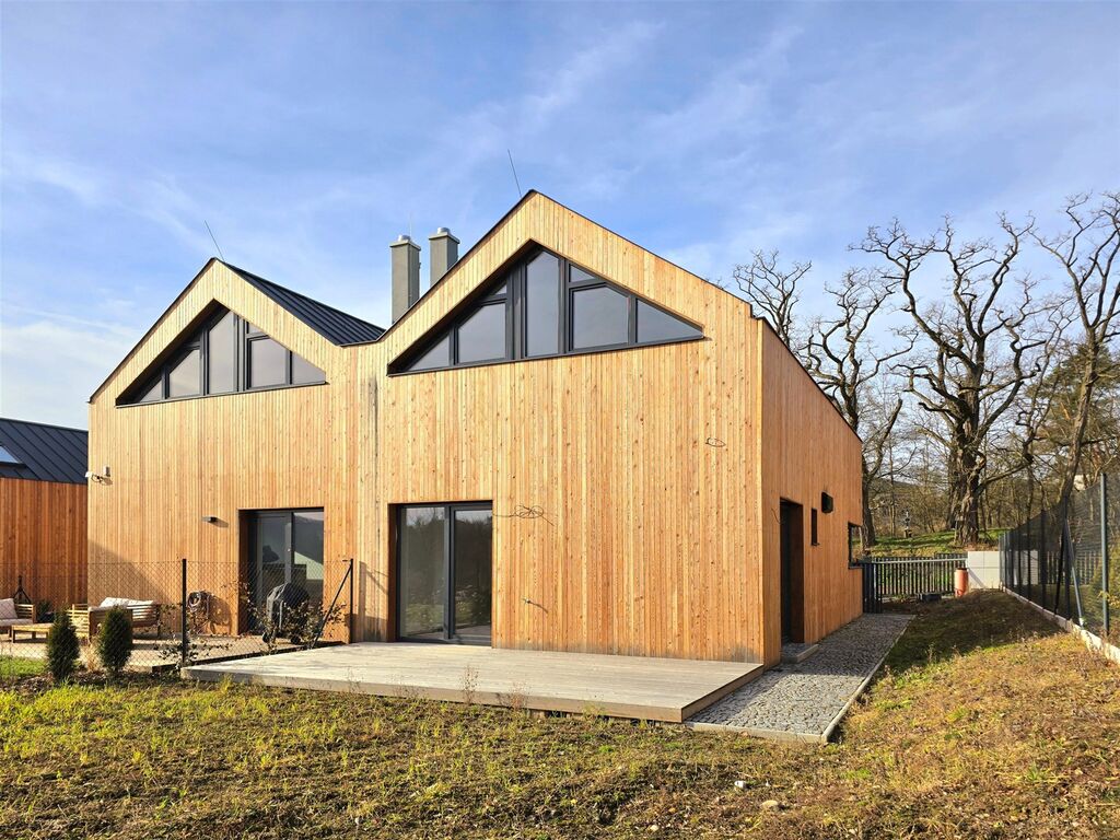 Moderní dispozice – obývací pokoj s dvojicí francouzských oken, kuchyň s výhledem do zeleně, 2 koupelny, technická místnost, 3 ložnice