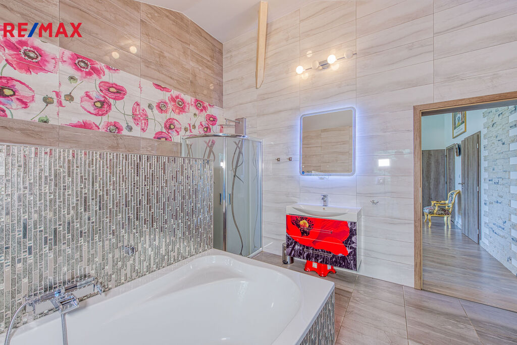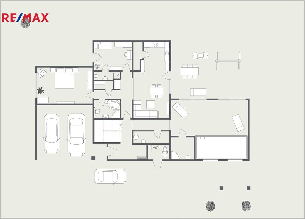 U vstupního prostoru do domu jsou dvě krytá parkovací stání s vyhřívanou příjezdovou cestou. Nemovitost je částečně podsklepena, zahrada je opatřena závlahovým systémem. Kromě toho nemovitost disponuje nadstandardním technickým vybavením – zabezpečovacím systémem s kamerami, klimatizací. Dalším pozitivem nemovitosti je velký přízemní prostor s příslušenstvím připravený k výstavbě bazénu s přístupem na venkovní terasu, který lze příp. využít jako ateliér či domácí fitness.