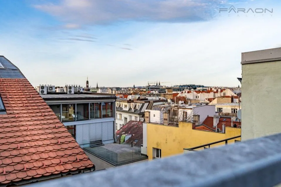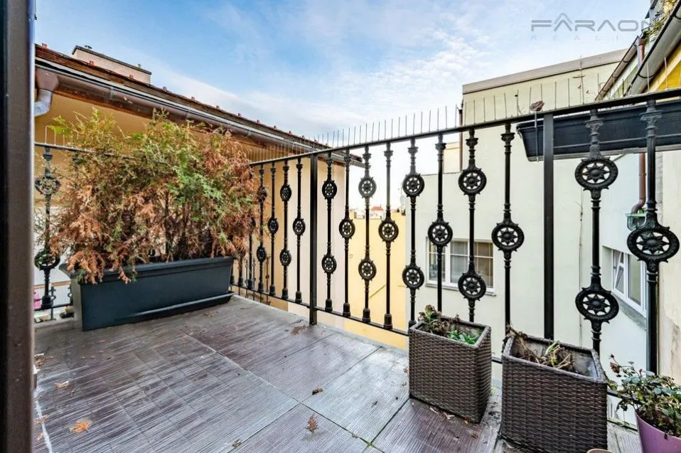 Prodej podkrovního klimatizovaného bytu 3+kk (115 m2) se střešní terasou (35 m2), balkonem (5,3 m2), sklepem a panoramatickým výhledem, v posledním patře historického nárožního domu Praha 1.