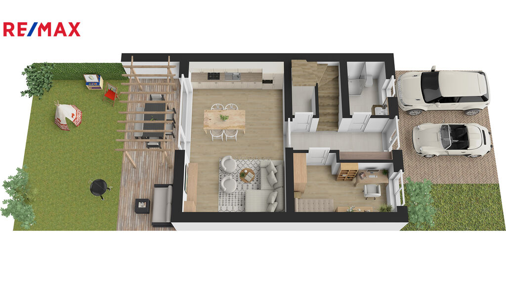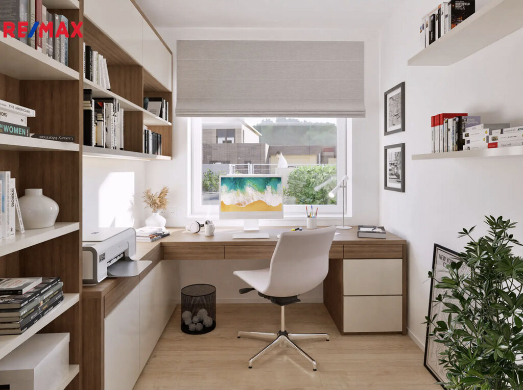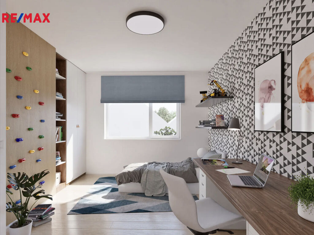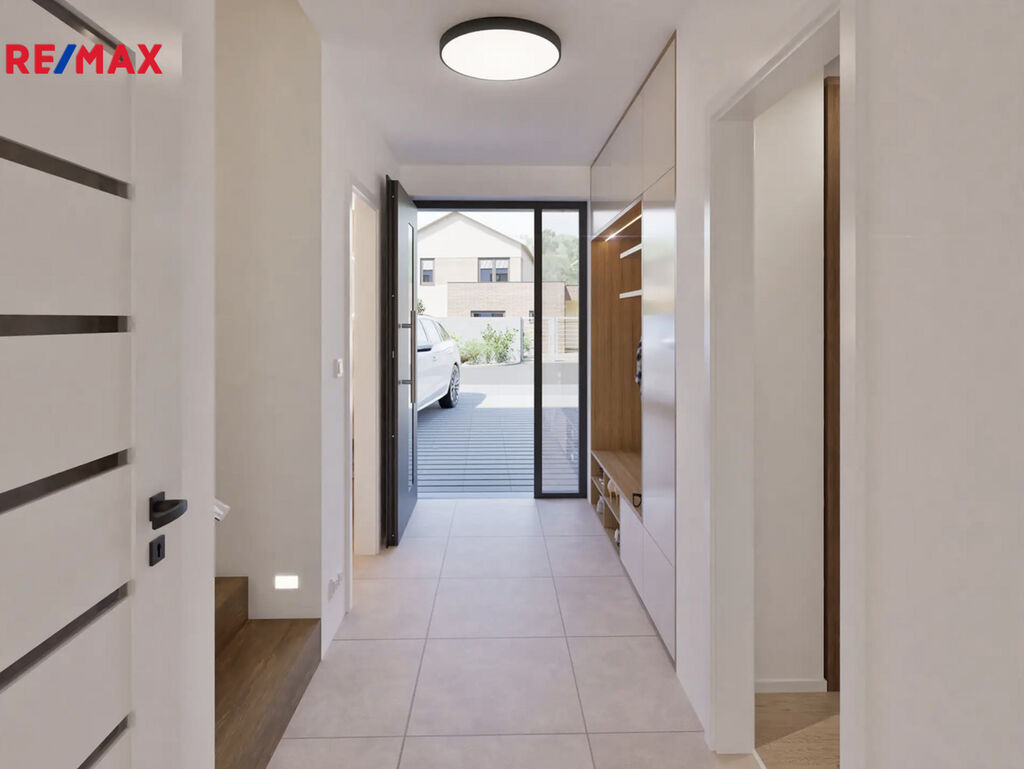 V přízemí domu bude vstupní chodba se schodištěm do patra, kde při vstupu budete mít po pravé straně koupelnu se sprchovým koutem a WC, na levé straně bude výklenek pro vestavěnou šatní skříň. Dále menší pokoj vhodný jako ložnice nebo pracovna. Rovně z chodby projdete do velkého obývacího pokoje, který bude spolu s velkým kuchyňským koutem a jídelnou dominantou celého domu. Z tohoto obývacího pokoje bude vstup na zahradu s terasou, kde si můžete postavit pergolou. Zahrada bude oplocená se zadní brankou pro pěší vstup. V chodbě domu pod schodištěm budete mít úložný prostor a v patře na vás budou čekat tři pokoje a hlavní koupelna s vanou a WC. Jako bonus vám zhotovíme plnohodnotnou velkou místnost v podkroví, kam povede běžné schodiště. Podkrovní pokoj bude mít všechny náležitosti jako jsou střešní okna, podlahovou krytinu, sádrokartonové podhledy i rozvody elektřiny. Tento podkrovní prostor můžete využít jako ložnici, pracovnu nebo hernu. Velkoformátová okna zajistí dostatek přirozeného světla a příprava na venkovní žaluzie umožní regulaci teploty v interiéru. Před domem budou dvě parkovací stání. Tepelné čerpadlo bude umístěné směrem do ulice.