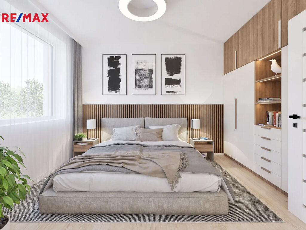 V přízemí domu bude vstupní chodba se schodištěm do patra, kde při vstupu budete mít po pravé straně koupelnu se sprchovým koutem a WC, na levé straně bude výklenek pro vestavěnou šatní skříň. Dále menší pokoj vhodný jako ložnice nebo pracovna. Rovně z chodby projdete do velkého obývacího pokoje, který bude spolu s velkým kuchyňským koutem a jídelnou dominantou celého domu. Z tohoto obývacího pokoje bude vstup na zahradu s terasou, kde můžete umístit pergolu. Zahrada bude oplocená se zadní brankou pro pěší vstup. V chodbě pod schodištěm budete mít úložný prostor a v patře na vás budou čekat tři pokoje a hlavní koupelna s vanou a WC. Jako bonus vám zhotovíme plnohodnotnou velkou místnost v podkroví, kam povede schodiště. Podkrovní pokoj bude mít všechny náležitosti jako jsou střešní okna, podlahovou krytinu, sádrokartonové podhledy i rozvody elektřiny. Tento podkrovní prostor můžete využít jako ložnici, pracovnu nebo hernu. Velkoformátová okna zajistí dostatek přirozeného světla a příprava na venkovní žaluzie umožní regulaci teploty v interiéru. Před domem budou dvě parkovací stání.
