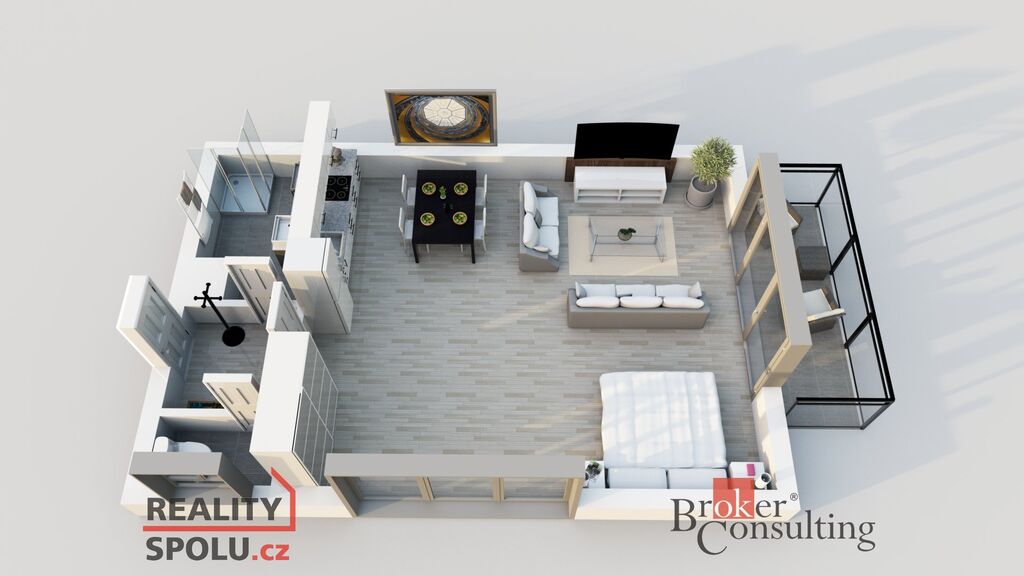 Dominantou bytu je rozlehlý obytný prostor s kuchyňským koutem, kam díky velkoformátovým proskleným oknům proudí maximum denního světla. Tato okna nejen prosvětlují interiér, ale také přirozeně propojují vnitřní prostředí s malebnou horskou krajinou.