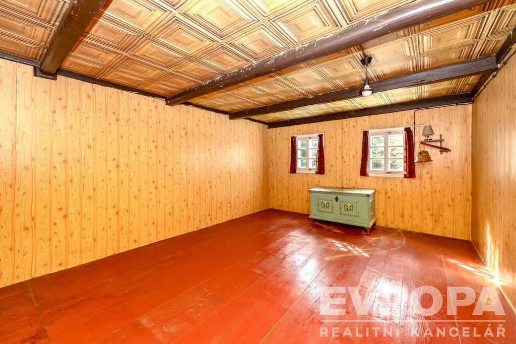 V přízemí obývací pokoj s kuchyní, komora, sklípek, dřevník, pokračujeme do prvního patra kde mohou být až čtyři pokoji. Ted jsou zde dva zimní s kamínky a letní.
