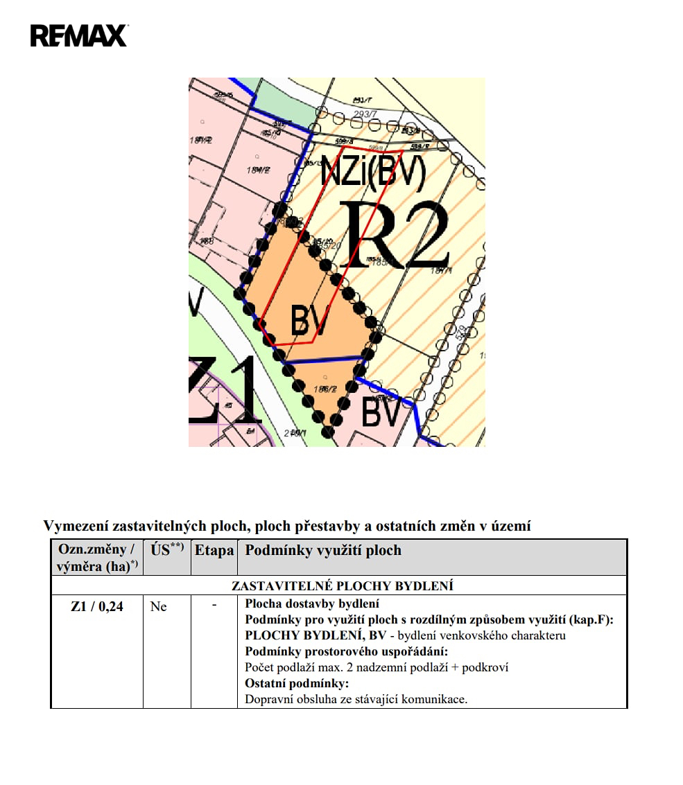 Pozemek se nachází v oblasti označené jako BV – bydlení venkovského charakteru. To umožňuje výstavbu rodinných domů či venkovských usedlostí s integrovaným hospodářským zázemím. Maximální povolená výška zástavby je 2 nadzemní podlaží a podkroví. Pozemek je z větší části určen pro výstavbu rodinného domu, menší část je evidována jako rezerva (viz přiložené fotografie).
