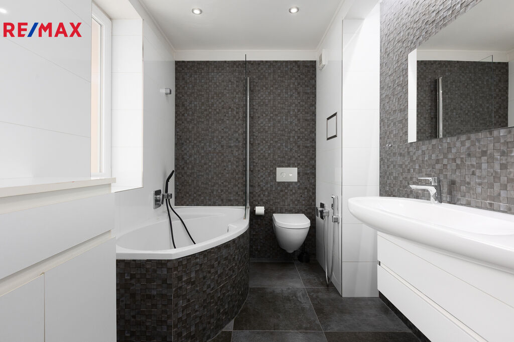 V bytě se nachází hostinská toaleta a koupelna. Komfort v chladných měsících zajišťuje podlahové vytápění v chodbě a koupelně, které dodává příjemné teplo a zvyšuje pohodlí. Celý dům je napojen na centrální dálkové vytápění, což zajišťuje efektivní a rovnoměrné vytápění všech místností.
