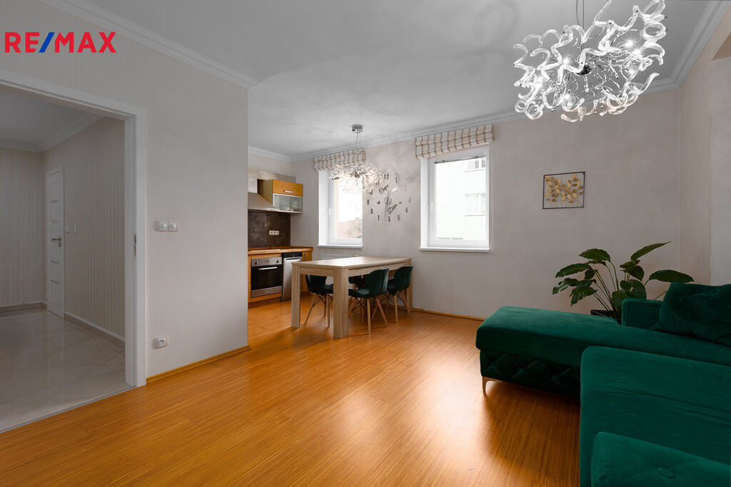 Dominantou bytu je prostorný obývací pokoj propojený s kuchyní, který tvoří otevřený a vzdušný prostor pro rodinná setkání i chvíle odpočinku.