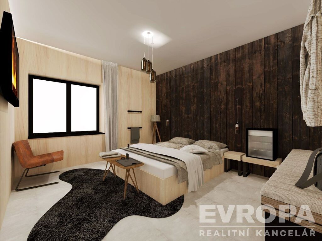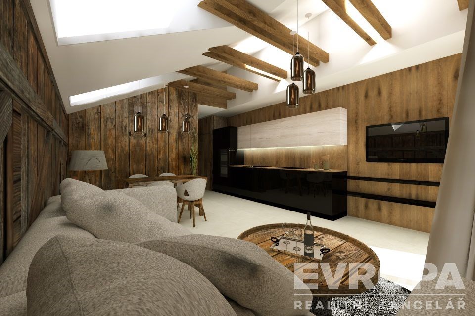 Apartmán nabízí prostorný, světlý obývací pokoj s plynulým přechodem do romantické lodžie s výhledem do údolí, jídelní kout, dvě samostatné ložnice, koupelnu, samostatné WC a praktické prostory v chodbách připravené pro vestavěné skříně a technické zázemí bytu. K dispozici je parkovací stání u domu a sklepní kóje pro uložení lyží nebo kol.