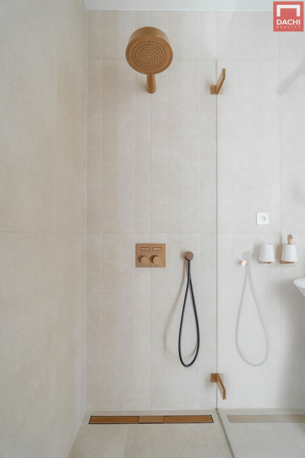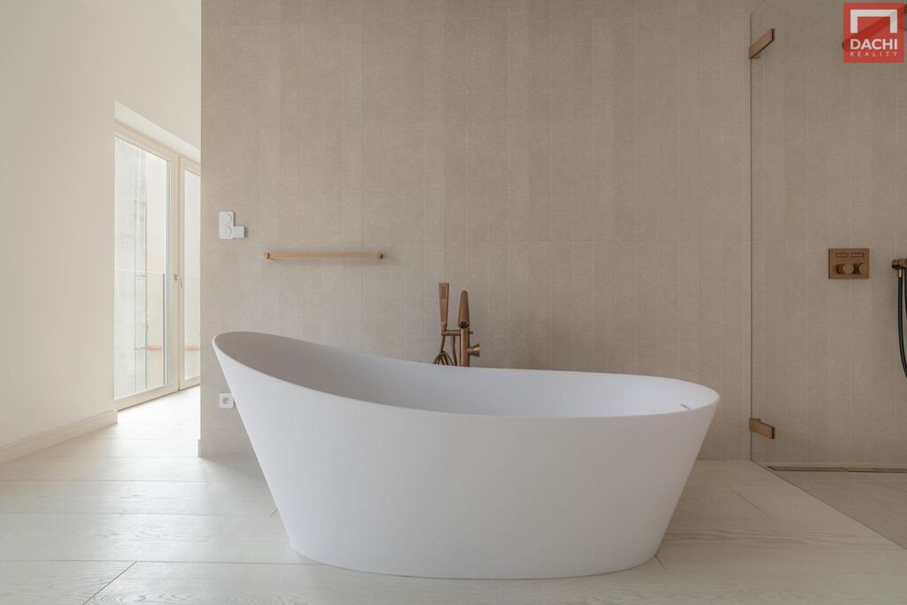Penthouse je vybaven špičkovými prvky: koupelny Gessi, osvětlení Modular, dřevěné podlahy Foglie DOro z dílny Valen and Masar, prémiová keramika Porcelanosa. Celkový dojem podtrhují bezfalcové dveře až ke stropu, které přirozeně navazují na výšku stropů a podtrhují nadčasovou eleganci celého prostoru.