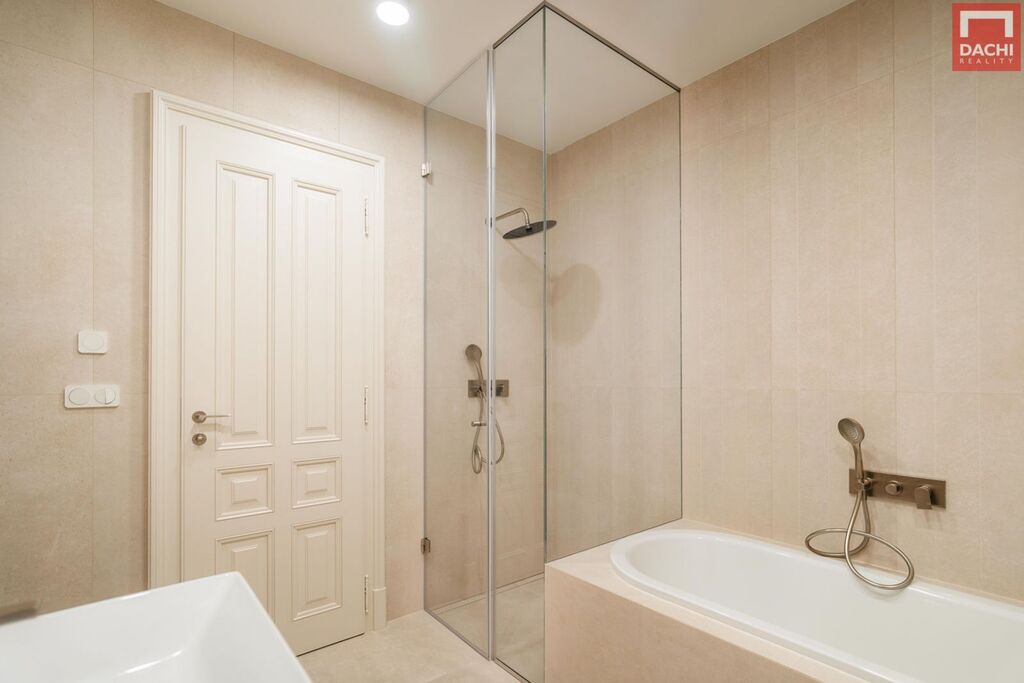 Součástí bytu je exkluzivní vybavení včetně koupelen Gessi, osvětlení Modular, podlah Foglie DOro od českých mistrů Valen and Masar a prémiové keramiky značky Porcelanosa.